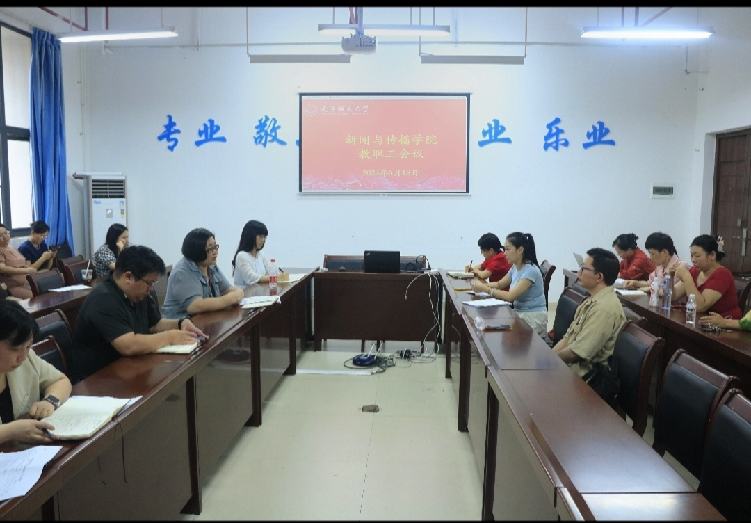 6月18日下午3点,新闻传播学院在理综楼304室召开了全体教职工会议。本次会议由学院党委书记聂卉主持,学院领导及全体教职工出席了会议。