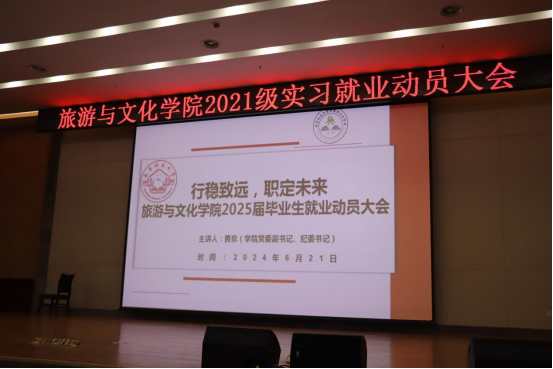 为了帮助同学们更好地做好就业规划、改善就业观念、提升就业竞争力,2024年6月21日下午,旅游与文化学院在图书馆报告厅举行了2025届毕业生就业动员大会。学院党委副书记、纪委书记黄珍,副院长钟学进,李宗耀老师,航空专业实习带队老师以及2025届毕业生参加了动员大会。本次动员大会由何滩老师主持。