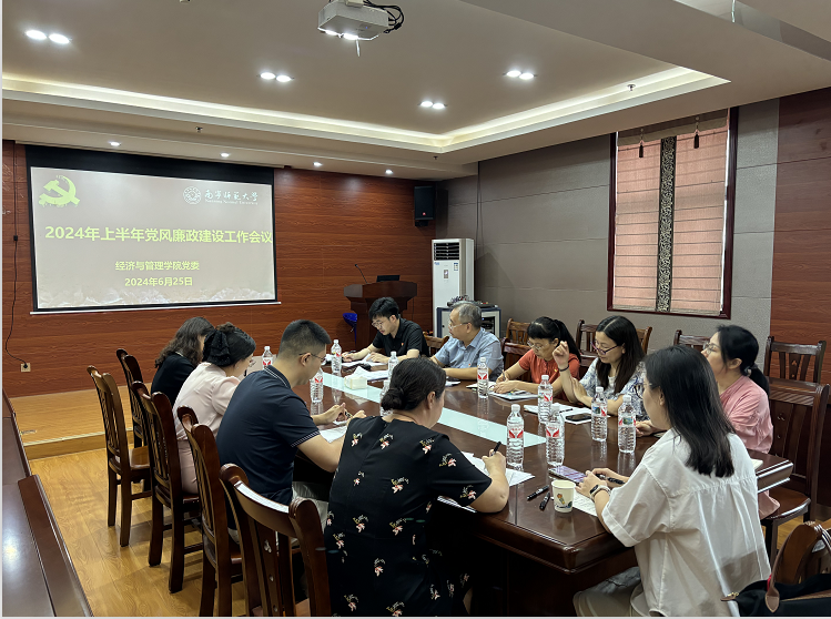 6月25日,经济与管理学院党委在五合校区理515室召开2024年上半年党风廉政建设、意识形态和安全稳定工作会议。学院党委委员、纪委委员、各支部书记参加了会议,会议由党委副书记、纪委书记何一飞主持。