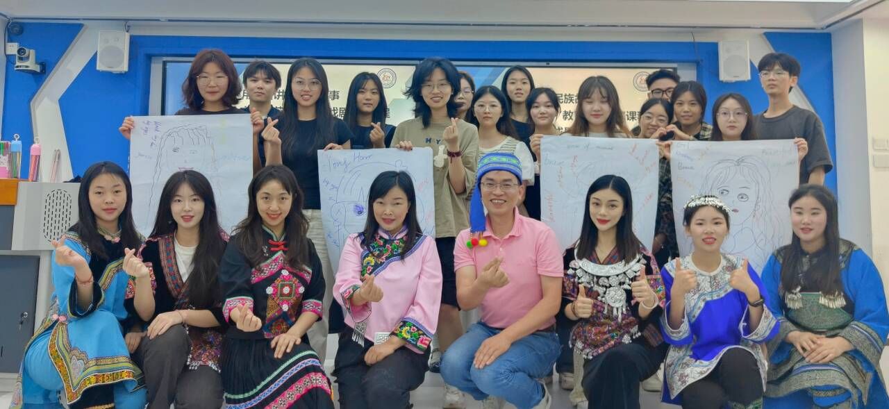 现场,南宁师范大学外国语学院教师叶悦带领黔南民族师范学院的同学们展示了一节《讲好中国故事——侗族民间故事长发妹》教育戏剧融合特色课。以广西侗族民间故事为主线,把侗族大歌、竹竿舞等多种民族元素融入课程,通过运用教育戏剧游戏和“墙上的角色”“静态画面”“良心巷”“声音剧场”等范式,呈现精彩的课堂。
