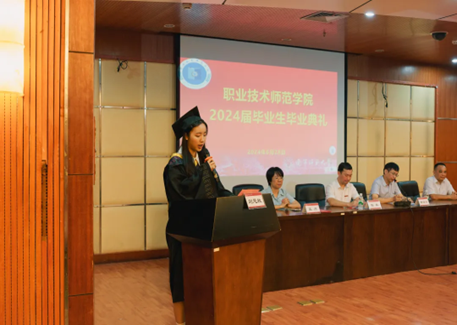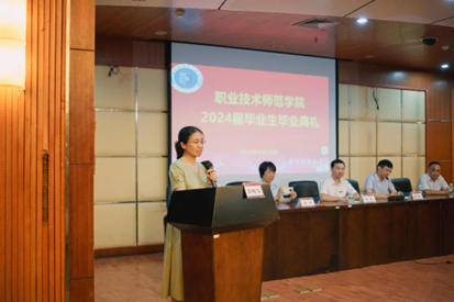 6月28日上午,职业技术师范学院2024届毕业生毕业典礼在明秀校区图书馆三楼报告厅举行。学院院长陈良,副院长唐锡海、蓝洁,组织员刘日龙、院长助理王忠昌及学院教师代表、辅导员和2024届毕业生参加本次典礼,毕业典礼由学院副院长唐锡海主持。