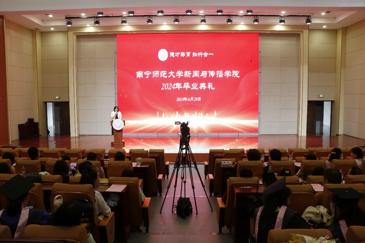 6月29日上午,新闻与传播学院在五合校区文综楼114报告厅内隆重举行了2024年毕业典礼。学院领导、教师代表、各系主任、20级班主任、学工办辅导员、毕业生家长代表以及全体2024届毕业生齐聚一堂,共同见证这一重要时刻。典礼由学院党委副书记黄敏主持。
