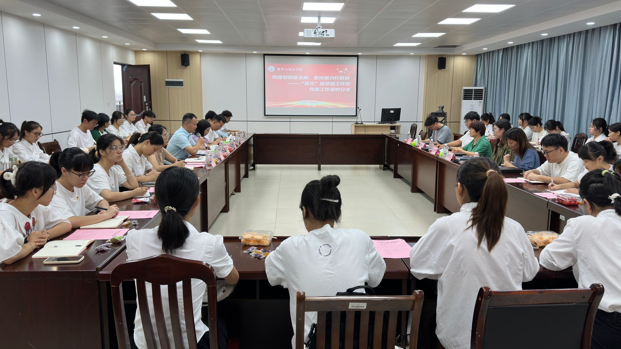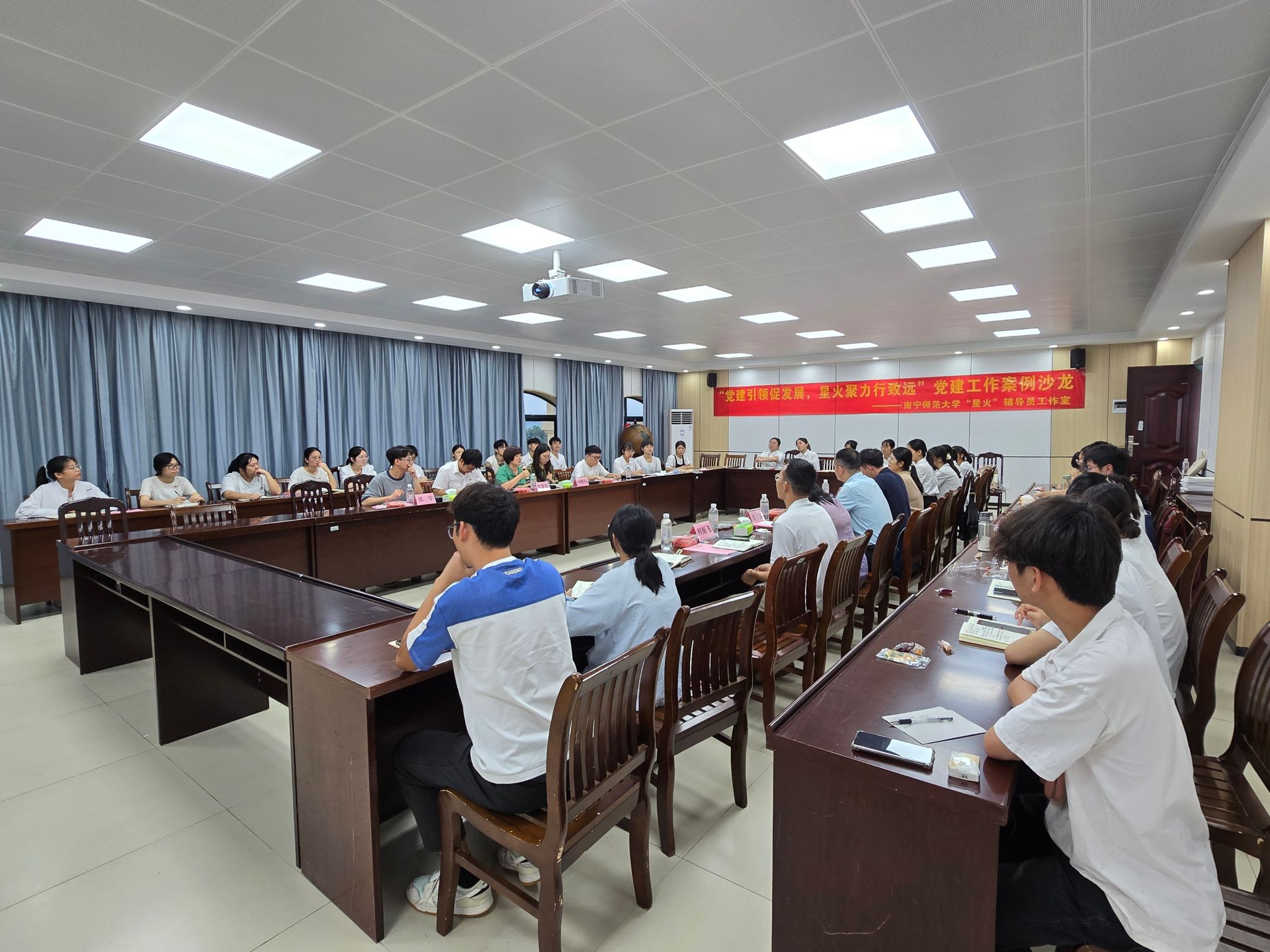 7月2日下午,南宁师范大学“星火”辅导员工作室举办“党建引领共提升,星火聚力行致远”党建案例沙龙,活动邀请了自然资源与测绘学院团委书记张慧荣老师、计算机与信息工程学院宋宏斌老师、环境与生命科学学院刘雅楠老师、音乐与舞蹈学院张宇老师、体育与健康学院农梦莲老师和该院全体辅导员、学生党支部党员代表共40余人参加此次沙龙,“星火”工作室负责人数学与统计学院党委付进副书记主持活动。