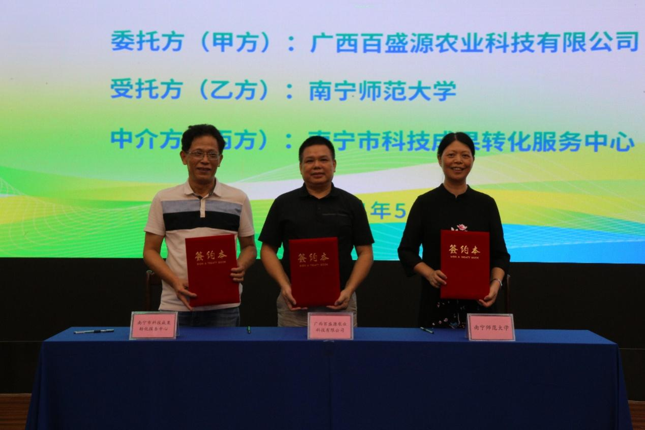近日,我校与南宁市科技成果转化服务中心、广西百盛源农业科技有限公司在南宁市科技企业孵化基地共同举行了科技成果转化暨产学研合作签约及授牌仪式。我校环境与生命科学学院何英姿教授项目团队、广西百盛源农业科技有限公司、南宁市科技成果转化服务中心和南宁市科技企业孵化基地等单位代表出席。