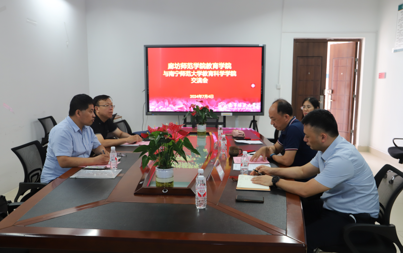 7月4日,廊坊师范学院教育学院党委书记张继立等2人到教育科学学院考察交流。教育科学学院副院长徐延宇、院长助理颜志雄以及教育系主任张艳敏参加交流。