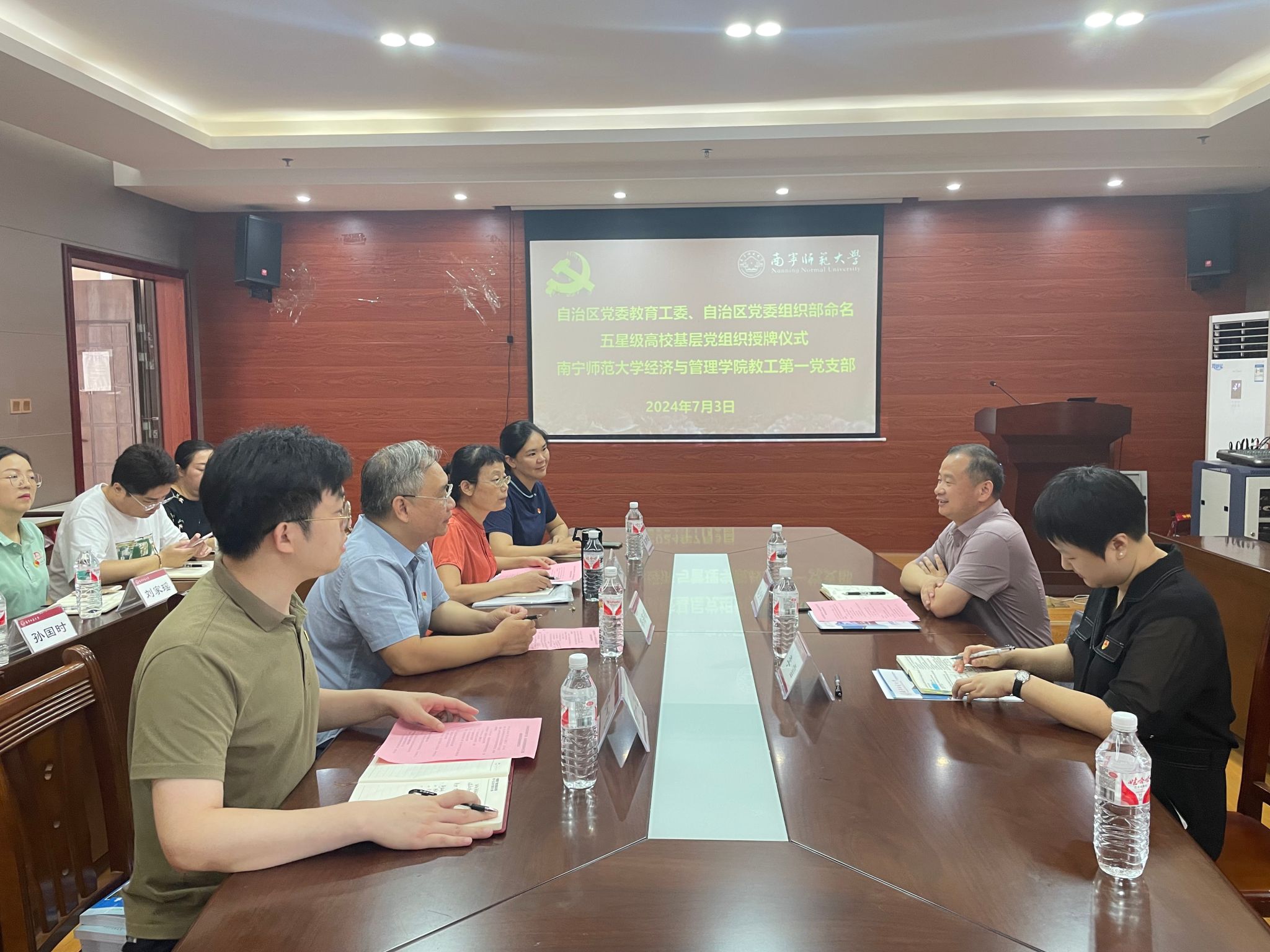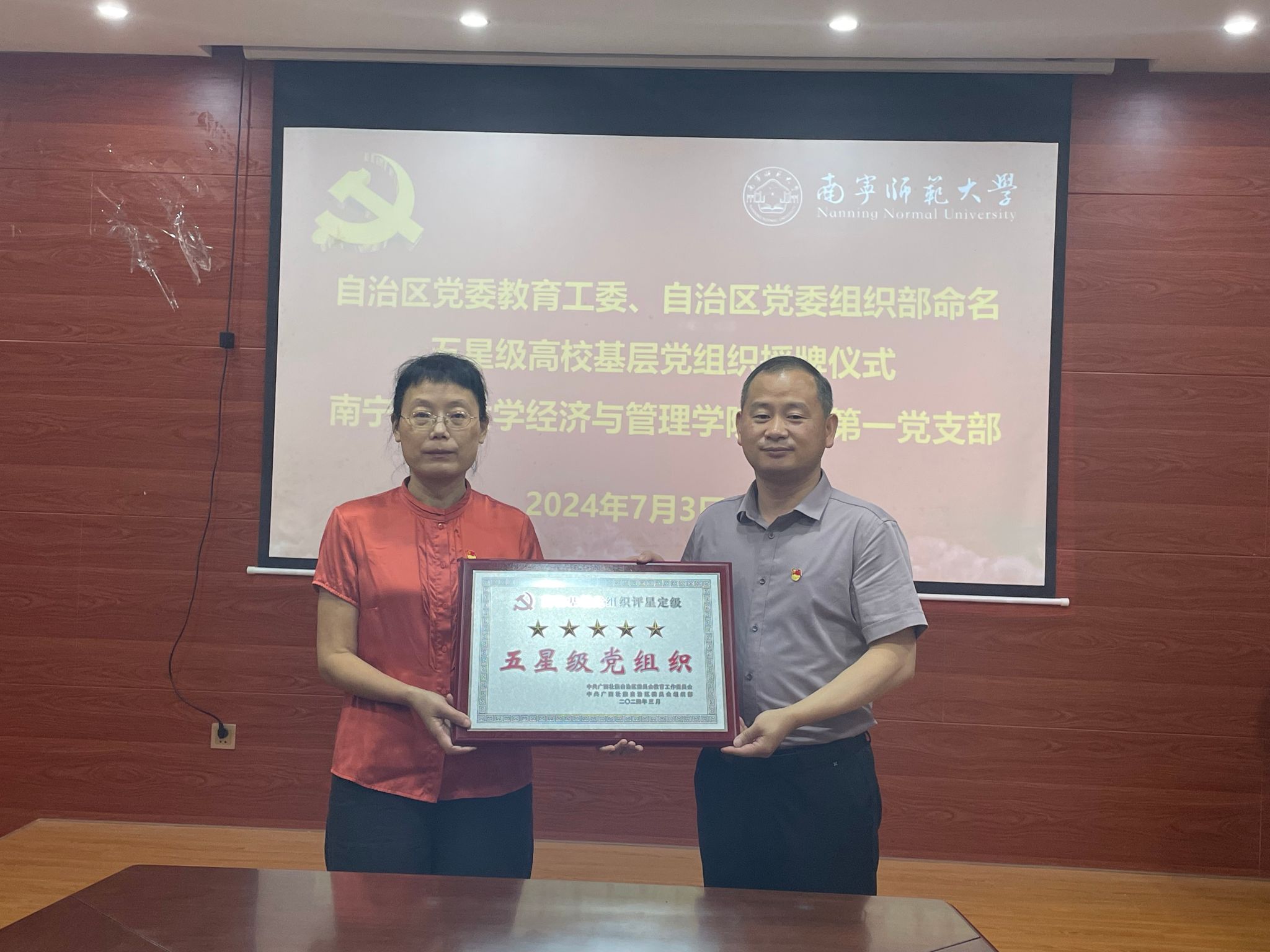 7月3日,学校“自治区党委教育工委、自治区党委组织部命名五星级高校基层党组织”授牌仪式在经济与管理学院举行,学校党委组织部副部长、乡村振兴工作办公室副主任吴少进出席授牌仪式并向经济与管理学院教工第一党支部授牌。授牌仪式由经济与管理学院党委书记韦海鸣主持,经济与管理学院党委委员、党支部书记、党员教师代表参加仪式。