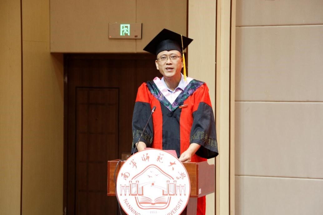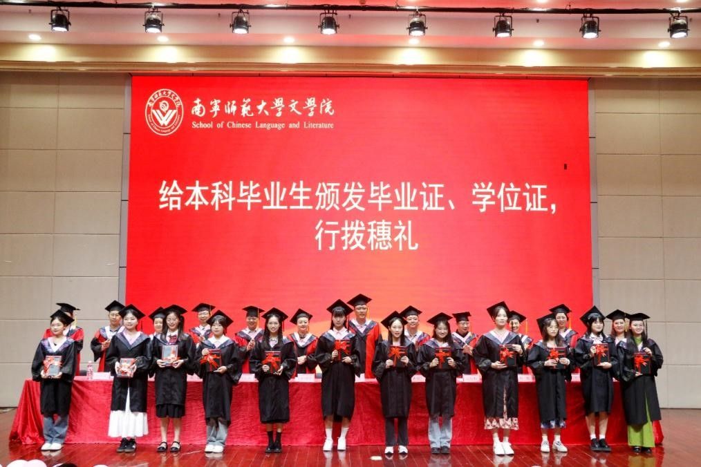 随后,毕业典礼在庄严的国歌中拉开帷幕。石勇院长为2024届毕业生致辞。他对毕业生们顺利完成学业表示热烈的祝贺,也对他们未来的发展寄予了殷切的期望。鼓励毕业生们应接续奋斗,在点点滴滴中不断积累与进步,用实际行动践行“厚德、絜行、传薪、探赜”的文学院院训。学院党委书记旷晓霞、副院长林安宁先后向大家宣读了南宁师范大学2024届本科生、研究生毕业及学位授予的有关文件。学院全体学术委员会委员为毕业生颁发毕业证书和学位证书并一一拨穗。毕业生们身着学位服,端举毕业证书,意气风发、笑容灿烂,享受毕业礼成的庄严神圣时刻。