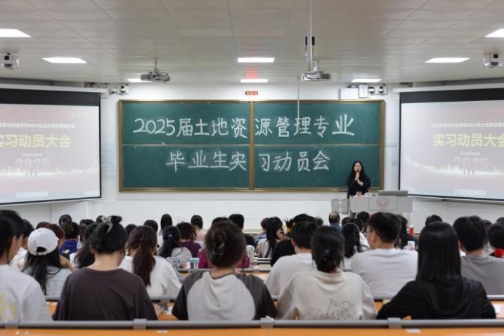 7月5日晚,自然资源与测绘学院土地资源管理系2025届毕业生实习动员大会在一号教学楼115阶梯教室举行。土管系党支部书记、系主任、副主任及教师代表,21土管1班、21土管2班级21土管专升本班141名同学参加,共同为即将踏上实习岗位的同学们精心筹备了一场别开生面的实习前动员大会,为2025届毕业生搭建起通往职场的坚实桥梁。
