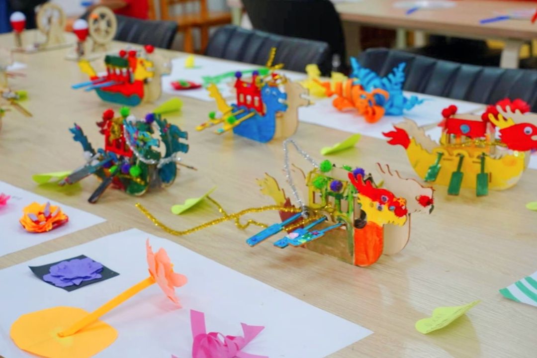 成果展示环节中,志愿者根据铸牢中华民族共同体意识教育、中华传统文化教育、科学实验课程等主题,详细介绍了各项成果,包括“中华民族一家亲”手抄报、绣球、灯笼、龙舟、剪纸、扇彩、民族服饰图画等学生亲手完成的手工艺品,以及发电机、水火箭等科学实验装置。最后,大家自由参观,展示活动顺利结束。