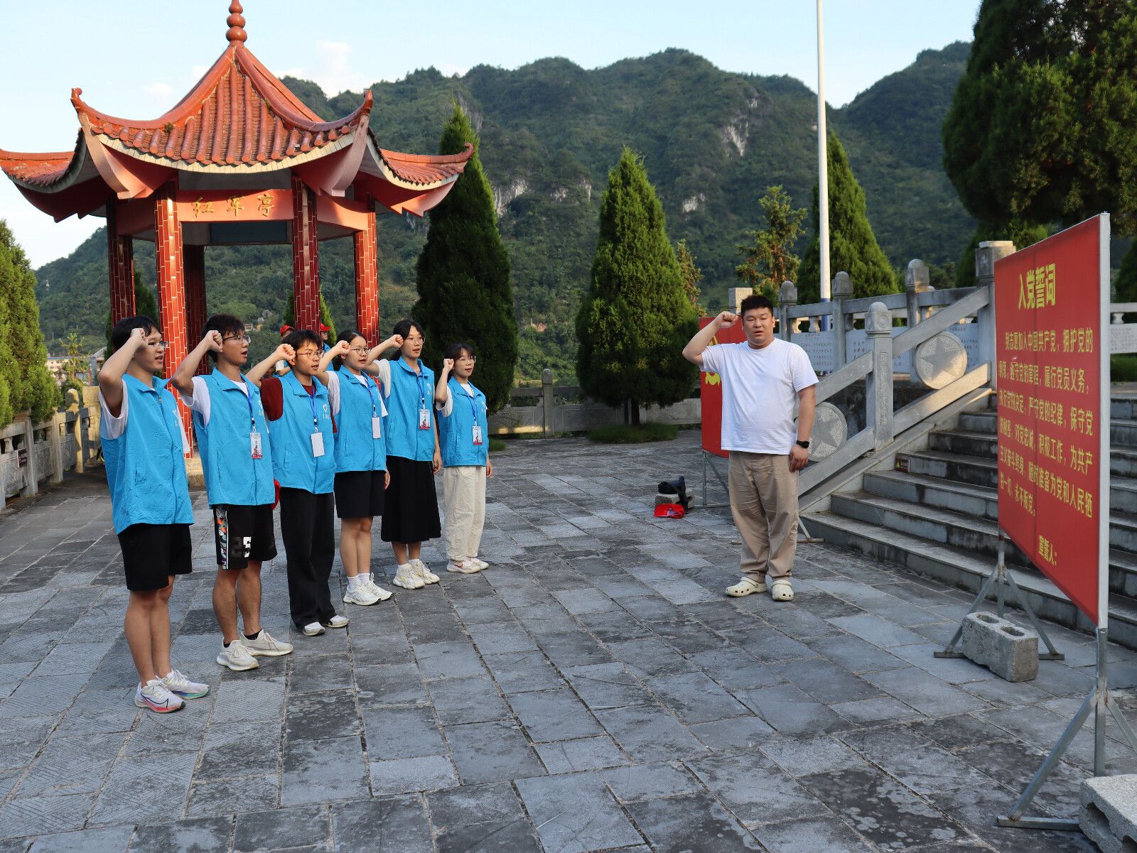 下午,志愿者们继续追寻红色印记,前往凤山县中亭乡被誉为“土地革命活化石”的红军田,青年志愿者中6名中共预备党员在团委书记王立彬老师的带领下于革命烈士纪念碑前重温入党誓词。在这片充满历史沧桑的土地上,青年志愿者们通过实地参观深刻了解了党的光辉历程和艰苦卓绝的奋斗足迹,更加坚定在新时代背景下,永远跟党走、矢志不渝为党和人民事业奋斗终生的政治信念。