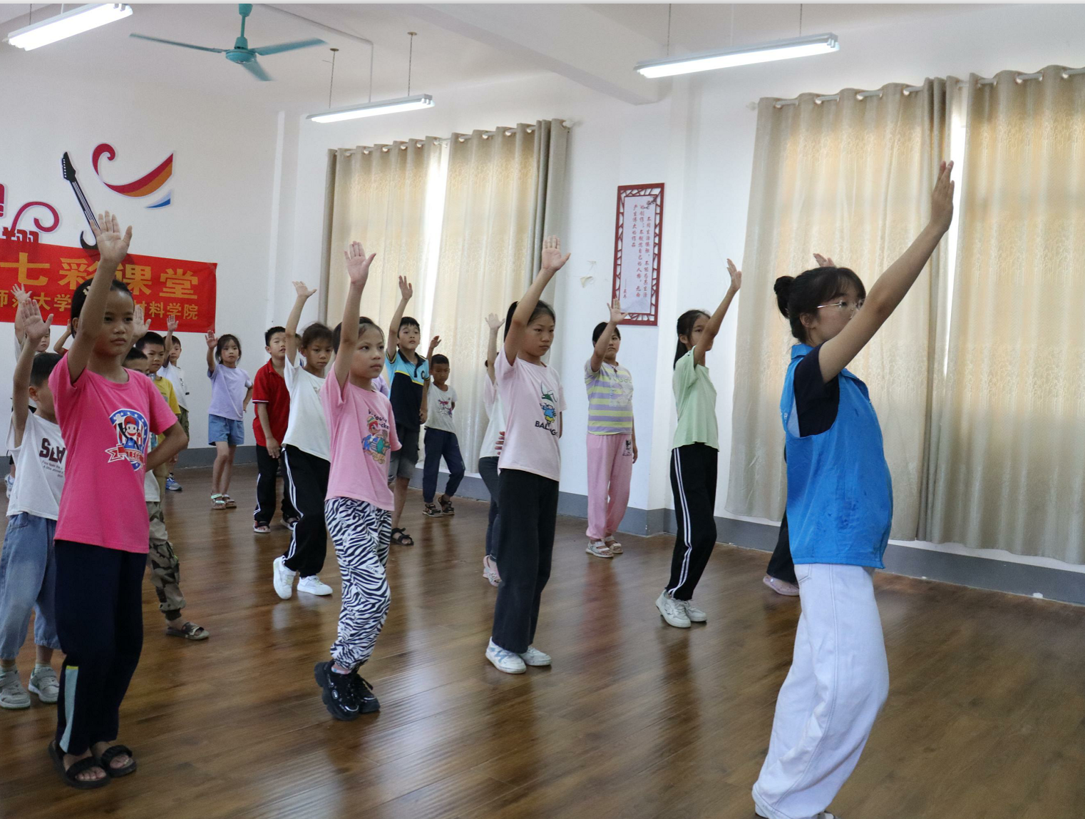 除此之外,服务团还开设了四史、书法、舞蹈、劳动教育和安全教育这五门课程。四史课堂上,志愿者通过讲述中国共产党成立的艰辛历程及党旗上镰刀和锤子的象征意义,引领小朋友们走进四史,助推小朋友们树立正确的历史观和价值观。书法课上,志愿者们从最基本的握笔姿势与坐姿规范讲起,耐心细致地纠正每一个细节,确保孩子们能够打下坚实的书法基础。舞蹈课上,在志愿者的指导下,小朋友们随着旋律轻盈起舞,用肢体语言诠释着青春的活力与朝气。劳动教育课上,志愿者以生动的语言和贴切的实例,向小朋友们讲述了劳动节的由来和劳动者的辛勤付出。通过打扫教学的劳动实践,小朋友们体会到了劳动的艰辛与快乐,更加深刻理解了“劳动最光荣”的道理。安全教育课上,志愿者运用贴近生活、生动有趣的案例向小朋友们详细阐述了溺水风险、交通安全等知识,使小朋友们在轻松愉快的课堂氛围中掌握安全知识,深刻理解安全的重要性。
