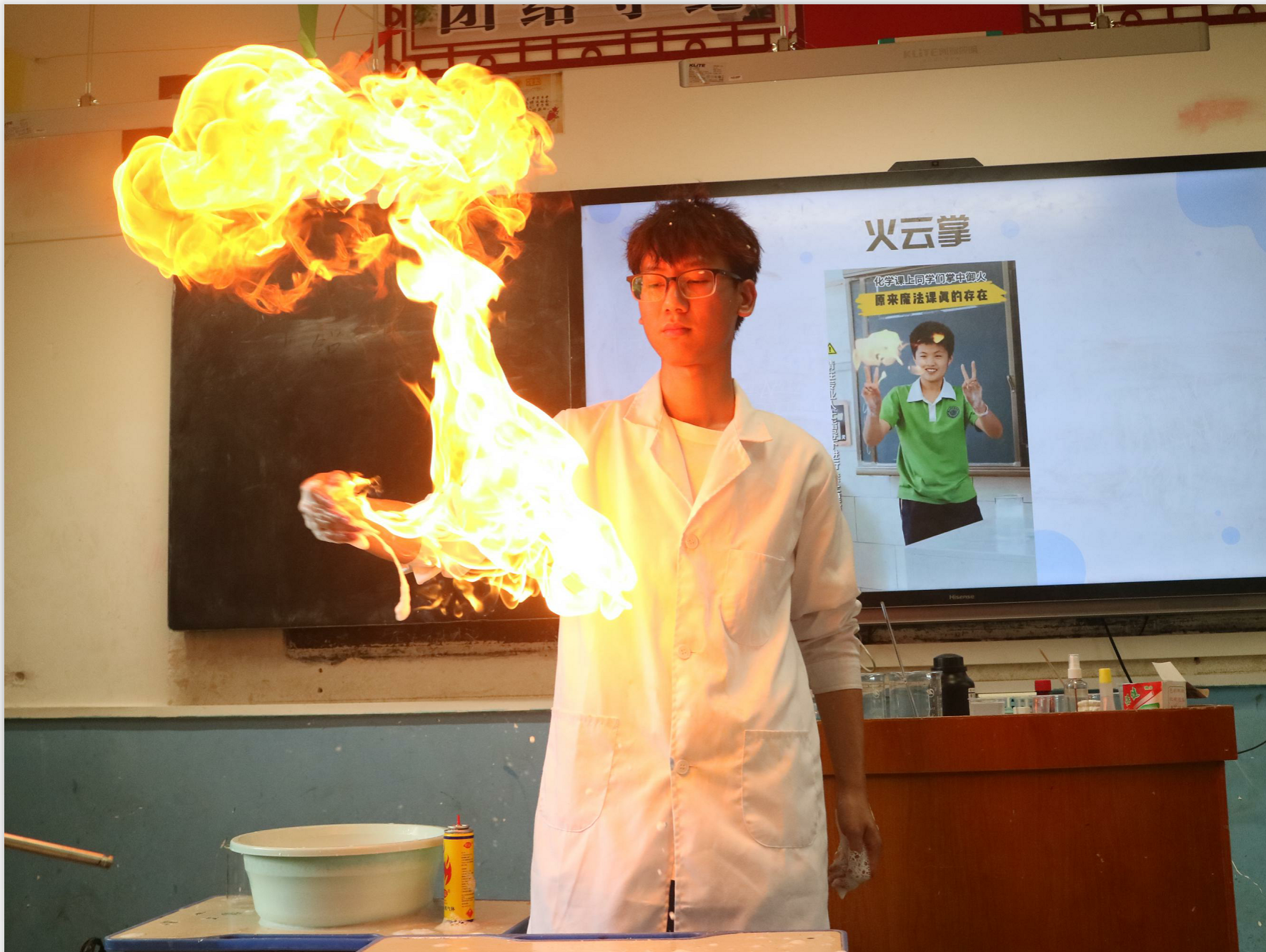 在化学实验课上,志愿者以“手工滴胶”的课程内容为切入点,塑造出科学与手工相结合之美,激发小朋友们对化学实验、探索世界奥妙的兴趣。随后,志愿者演示了“神奇水”实验,引导小朋友们观察烧杯中溶液颜色变化的奇妙过程。紧接着,志愿者邀请小朋友们上台协助演示实验,使小朋友们感受到了化学反应的魅力。而当课堂逐渐推向高潮时,志愿者更是施展出“火云掌”绝技,以一系列酷炫而精彩的姿势,将这节化学实验课演绎得既震撼又充满乐趣。