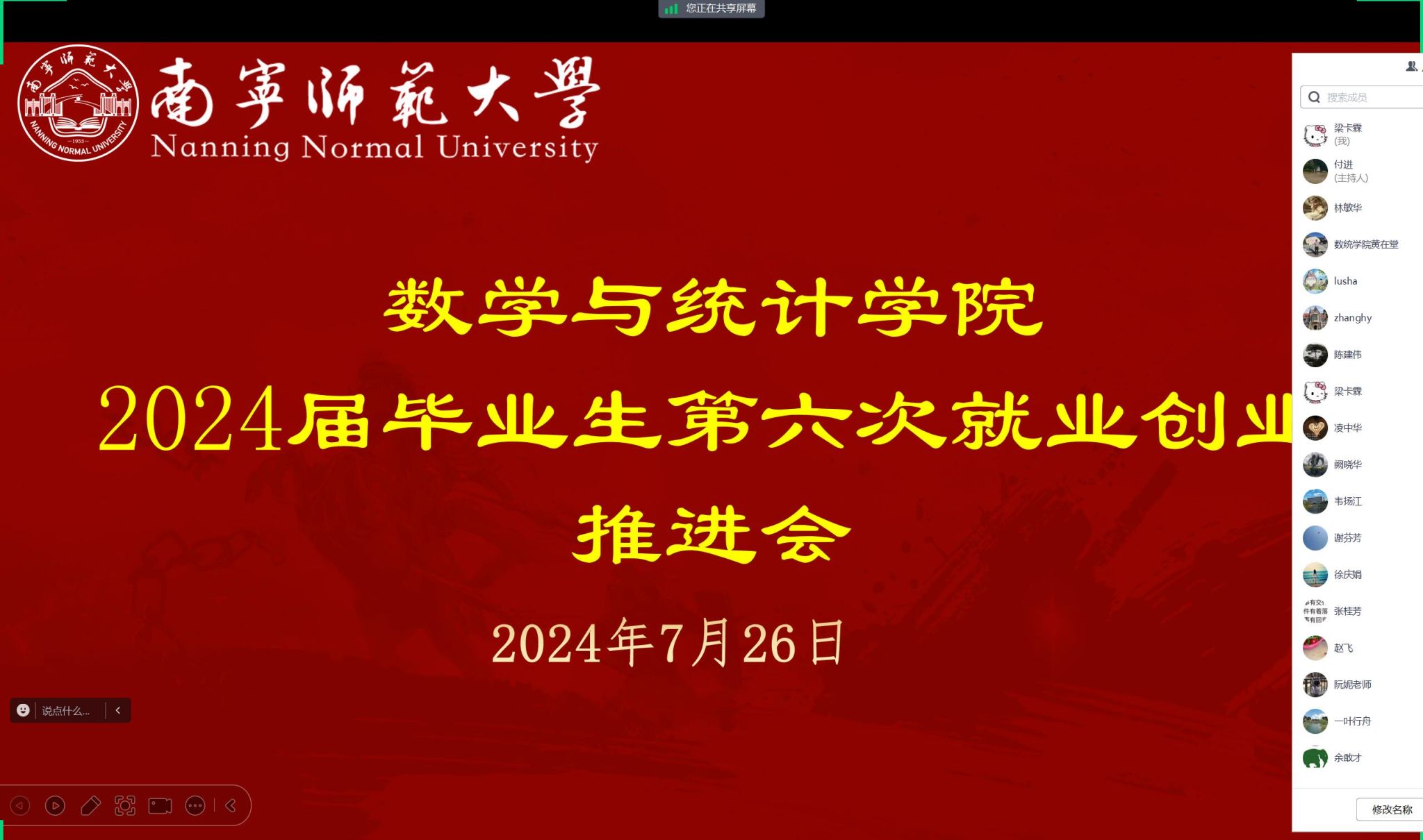 为扎实推进数学与统计学院2024届毕业生就业创业工作,7月26日下午,数学与统计学院在线上召开了2024届毕业生第六次就业创业推进会。数学与统计学院领导班子、硕士生导师、本、专科毕业班的班主任和负责就业工作的辅导员参加此次会议,党委付进副书记主持本次会议。