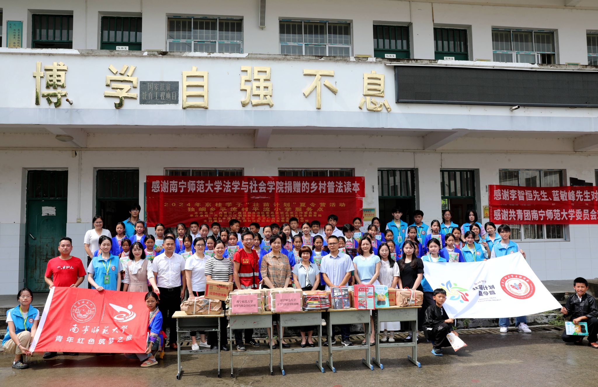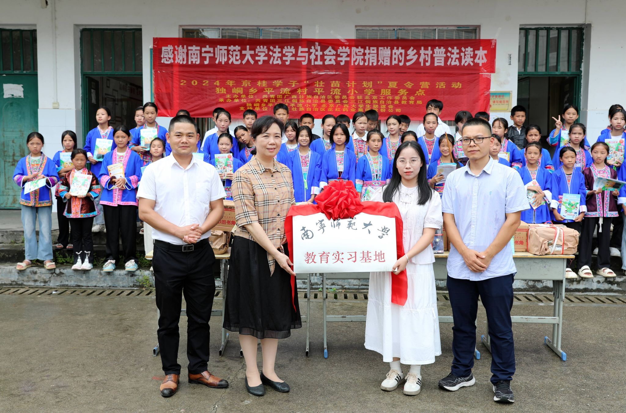 授牌仪式上,我校法学与社会学院捐赠了一批居民普法读本。据悉,今年7月,该学院组建了大学生志愿者暑期“三下乡”社会实践团队到平流小学开展义务支教活动;7月29日至8月10日,该学院作为协办单位为2024年京桂学子“壮苗计划”夏令营活动平流小学支队提供组织协调帮助。今后,法学与社会学院将定期组织师生深入平流小学开展支教活动、科普讲座、文化艺术交流等丰富多彩的实践活动,将继续为孩子们带去新的信息和知识,并通过言传身教,激发他们探索未知、追求梦想的热情。同时,该教育实习基地将成为高校师生了解乡村、研究乡村、服务乡村的重要平台,促进理论与实践的深度融合,为乡村振兴战略提供智力支持和人才保障。