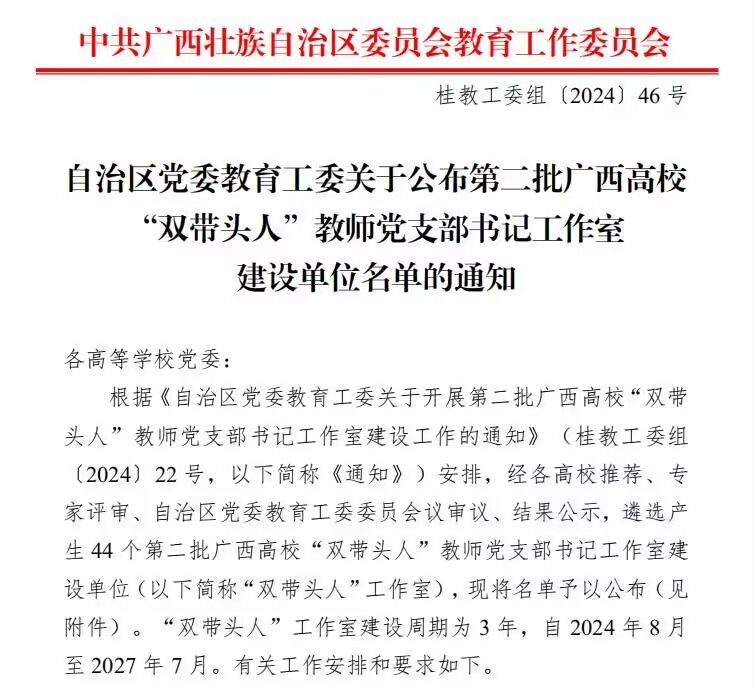 近日,自治区党委教育工委公布了第二批广西高校“双带头人”教师党支部书记工作室建设单位名单,文学院教工第一党支部书记工作室荣列其中。