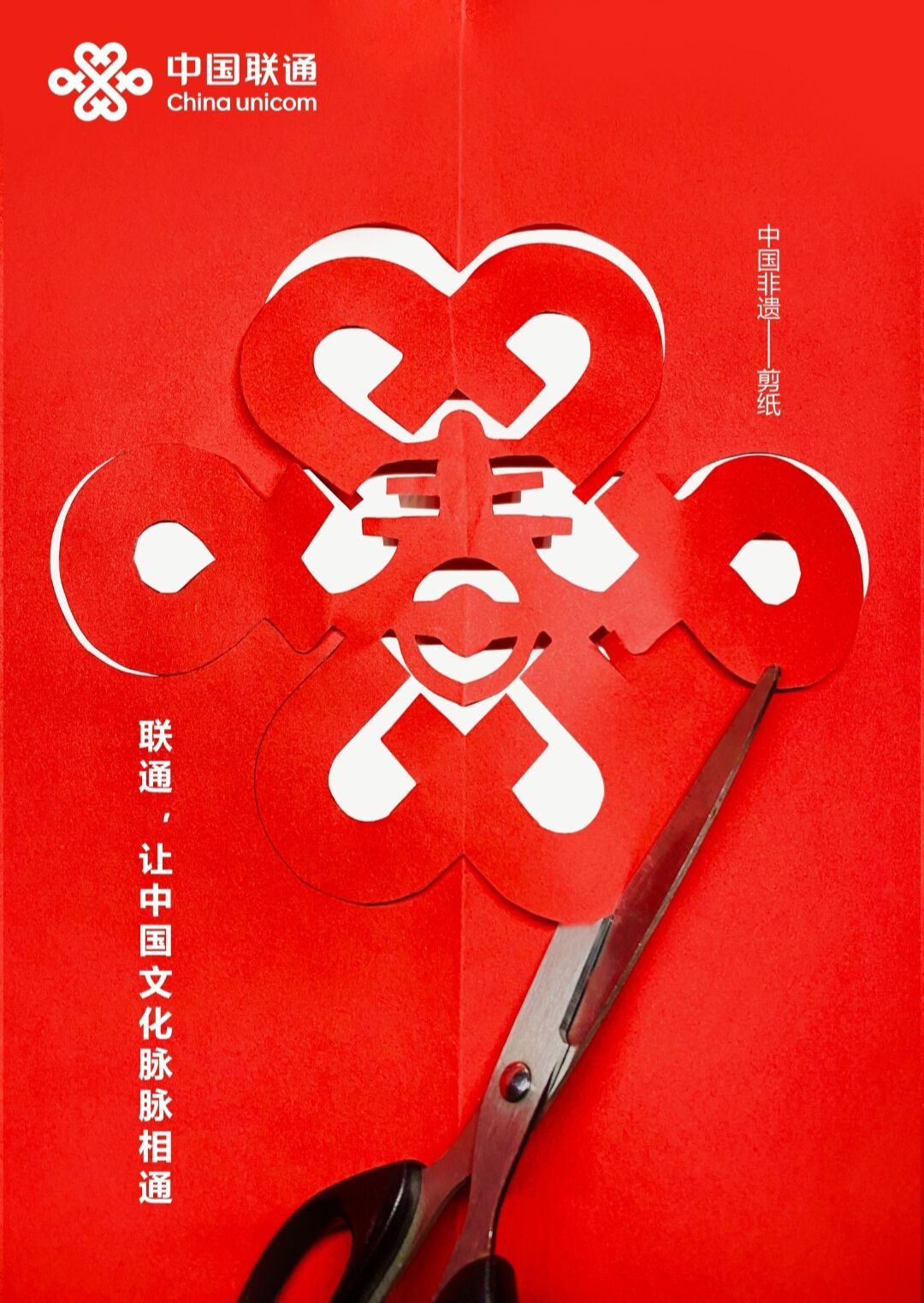 《联通,让中国文化脉脉相通》是黄彬婷同学在广告系教师宋丽丽的指导下创作的平面类作品。该作品以剪纸的形式巧妙地将双喜字、福字、春字与中国联通LOGO融为一体。这不仅有助于提升中国联通的品牌形象和市场竞争力,更弘扬了中国非遗剪纸艺术,促进了中国传统文化的传承和发展。