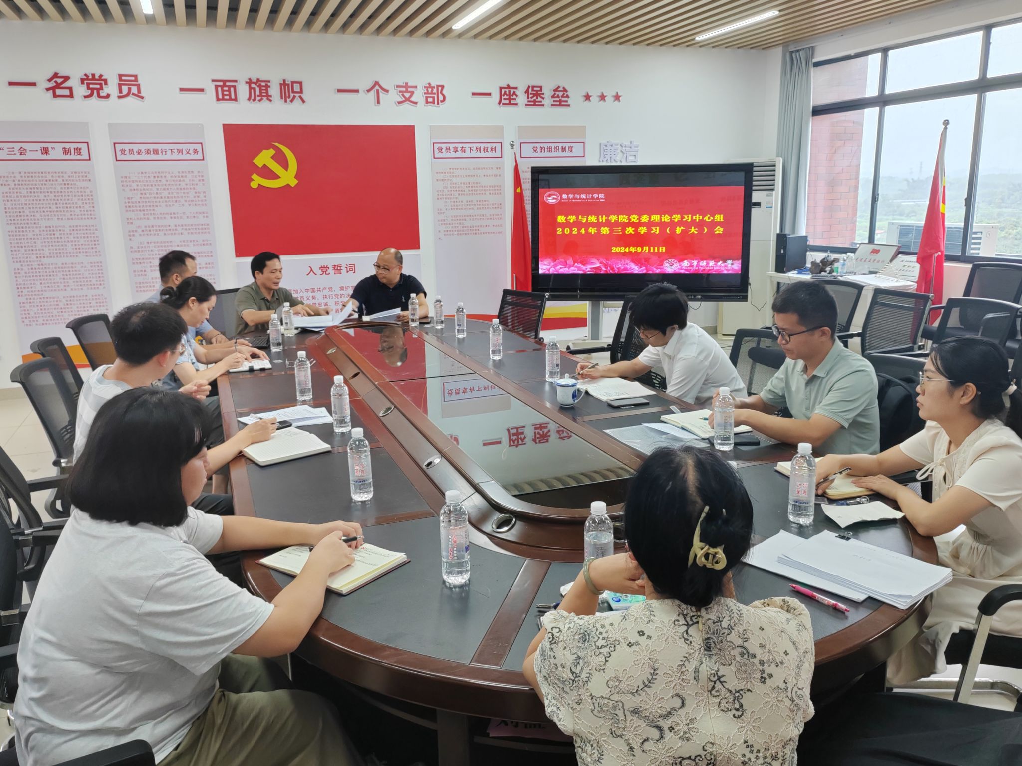 9月11日下午,数学与统计学院党委理论学习中心组在武鸣校区数统楼A501党员活动室召开党委理论学习中心组2024年第三次学习(扩大)会,专题学习党的二十届三中全会精神、习近平总书记在全国教育大会上的重要讲话精神等。该院党委理论学习中心组成员、办公室主任、学生支部书记参加会议。会议由该院党委书记余敢才主持。