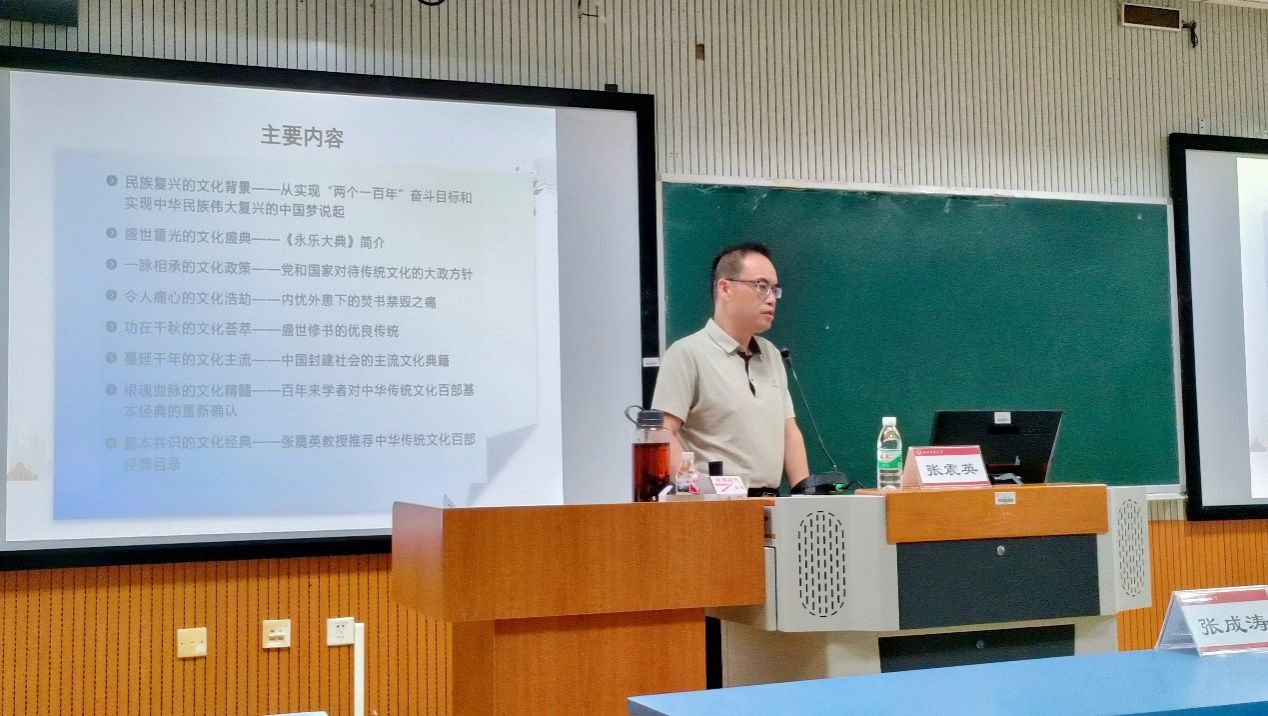 为深入学习和传承中华优秀传统文化,加强同学们对中华传统文化典籍的理解与认识,9月10日下午,职业技术师范学院在文星楼315教室开展“中华传统文化典籍的汇聚、遗散与再凝练”主题讲座。本次讲座由南宁师范大学学报编辑部主任、博士研究生导师张震英教授主讲,2022级、2023级本科生参加。