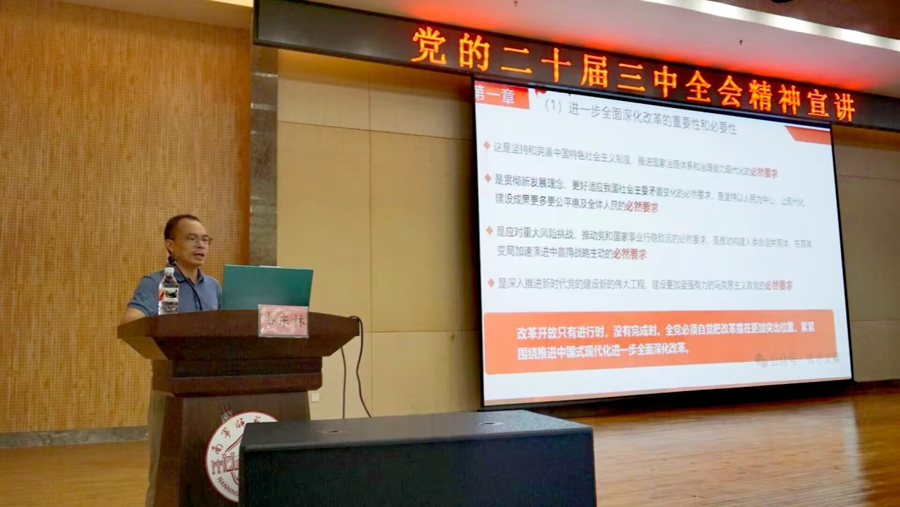 为深入学习贯彻党的二十届三中全会精神,让青年学子了解全会动态,学习全会精神,进一步明确青年一代新使命,9月18日晚,环境与生命科学学院召开主题为“笃学、深思、力行”的学习贯彻党的二十届三中全会精神辅导会。主讲人为学院党委副书记(主持党委工作)韦东林。