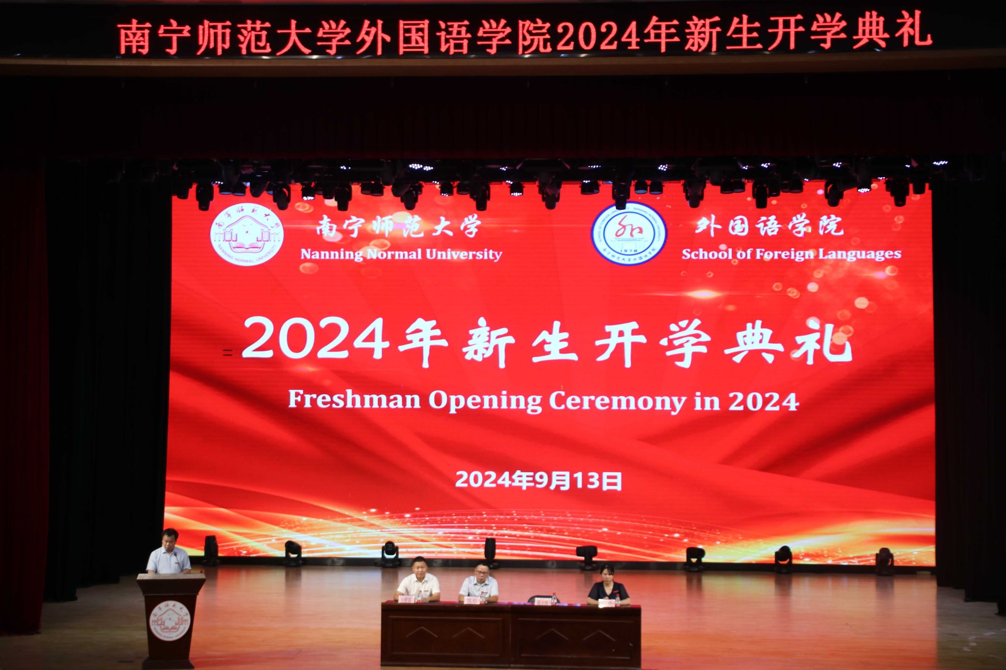 9月13日下午,南宁师范大学外国语学院于武鸣校区音舞楼千人演播厅举办2024级新生开学典礼。外国语学院党委书记苏华、院长陈光伟、党委副书记刘晖晖、副院长蒙岚、学院部分教师以及2024级全体新生参加了本次典礼。本次典礼由外国语学院党委副书记刘晖晖主持。