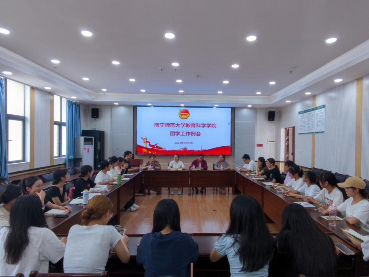南宁师范大学教育科学学院团学工作例会于9月19日下午在五合校区理综1003教室如期举行。出席本次会议的有学院党委副书记谢珊、团委书记蒋欢和辅导员郭恒、梁精泉、周芳、巫福星老师以及分团委学生会干部。
