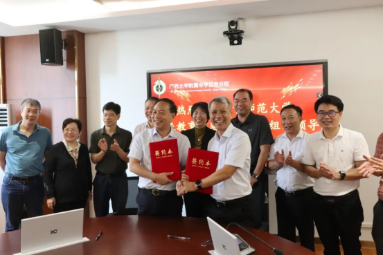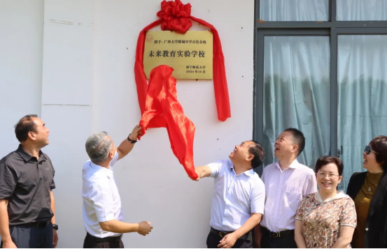 为推动高等师范院校与中小学校的资源共享、协同发展,进一步推进南宁师范大学未来教育实验学校项目建设,针对中小学的个性需求提供研究与指导服务,10月10日上午,南宁师范大学未来教育研究院院长陆云率队前往广西大学附属中学百色分校进行调研。广西大学附属中学百色分校校长李良刚、副校长唐运团、谢松,教务处主任韦升以及各年级备课组长共同参加了活动。双方在学校四楼多功能会议室举行了“未来教育实验学校”共建合作协议签署及揭牌仪式,标志着南宁师范大学与广西大学附属中学百色分校的合作正式开始。