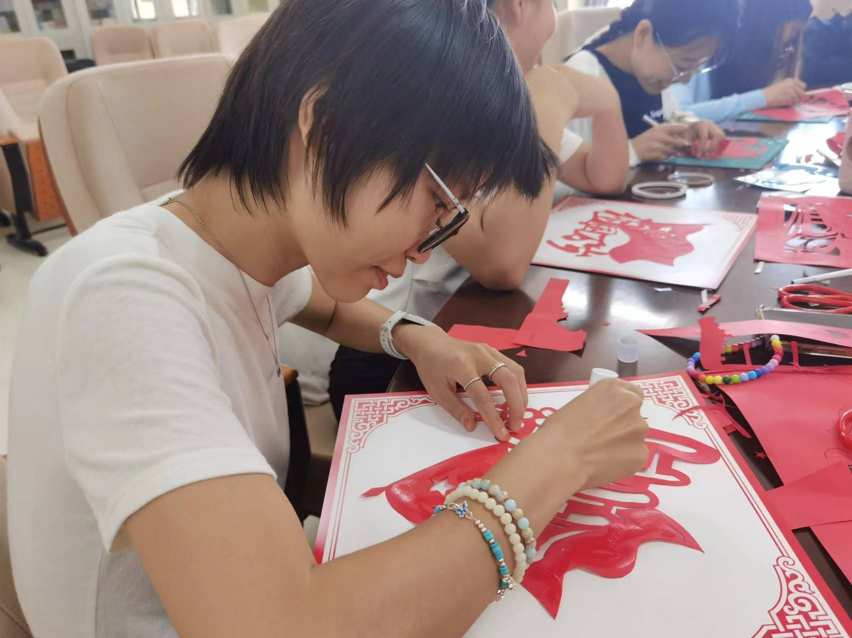 为庆祝中华人民共和国成立75周年,弘扬和传承中华优秀传统文化,10月9日上午,外国语学院研究生学术班党支部在实验楼1B614党员活动室举行“巧手裁剪庆华诞,不忘担当颂党恩”主题党日活动,此次活动由支部书记马旭冉主持,学术班党支部各位党员同志参与。