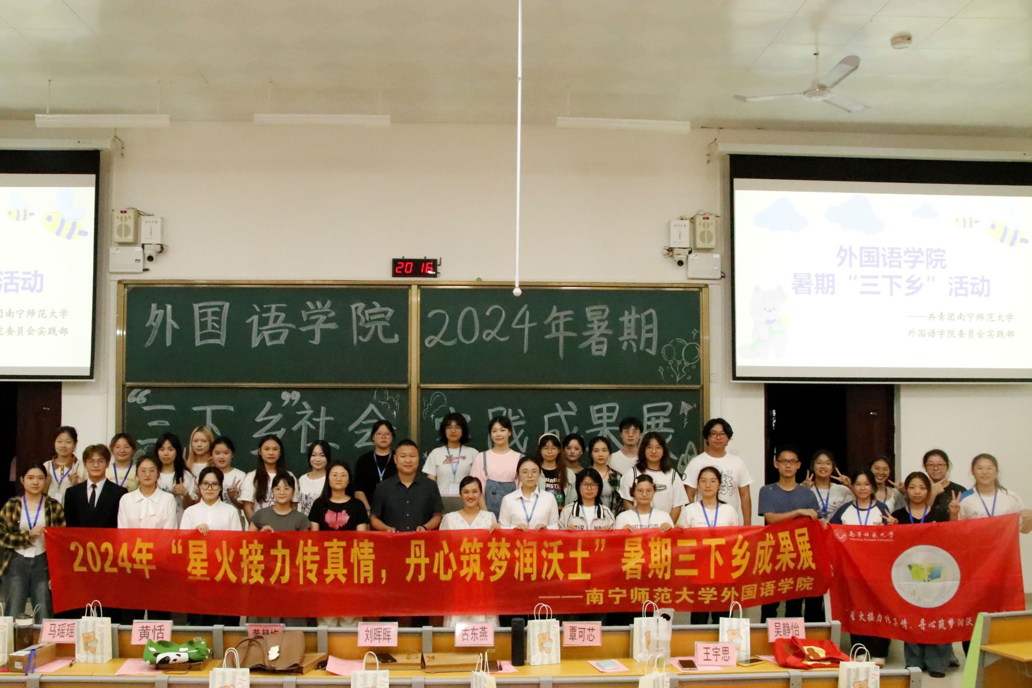 为提升同学们对暑期“三下乡”社会实践活动的认识,激发大学生对志愿服务活动的热情,外国语学院于10月16日晚在武鸣校区实验楼2A-105教室举办“星火接力传真情,丹心筑梦润沃土”为主题的2024年大学生暑期“三下乡”活动成果展。出席本次活动的有外国语学院党委副书记刘晖晖老师、学工办古东燕老师、黄慧梅老师、黄恬老师、院团委学生会团副主席团成员、武鸣校区各二级学院学生代表以及“三下乡”的志愿者和大一大二相关专业同学。