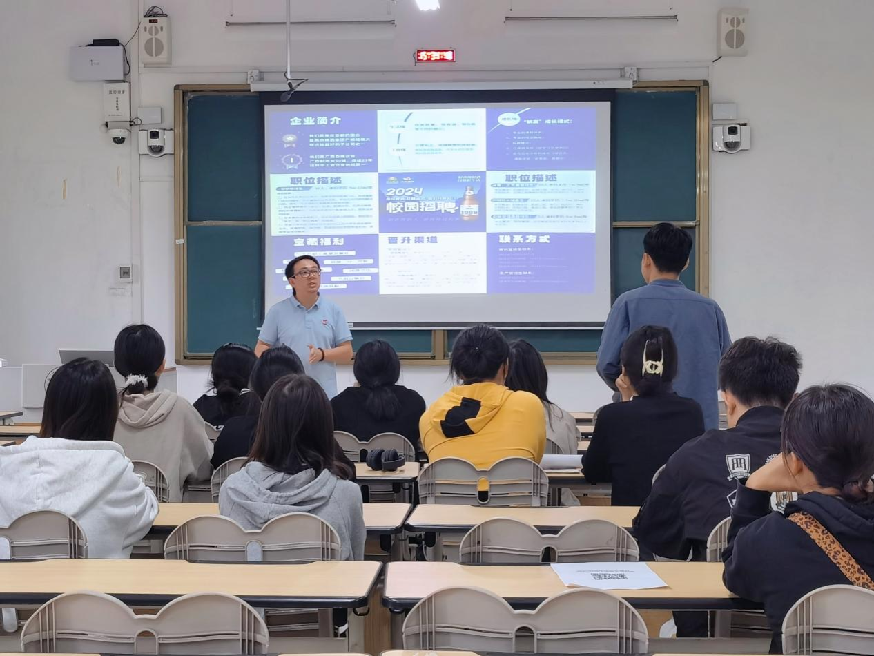 10月28日下午,燕京啤酒(桂林漓泉)股份有限公司在我校武鸣校区一号教学楼117教室举办专场宣讲会,来自学校物流管理、环境工程、环境科学、自动化等专业约15名应届毕业生参会。