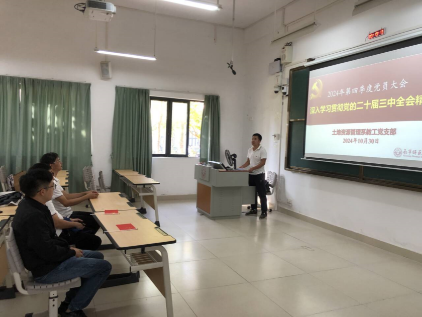 10月30日,自然资源与测绘学院土地资源管理系教工党支部于武鸣校区开展主题党日活动,支部全体党员参加集中学习。会议集中深入学习贯彻党的二十届三中全会精神及全国教育大会精神,全体党员同志分享学习心得,并就如何将全会精神和教育大会精神更好融入到教育工作一线展开了热烈讨论。