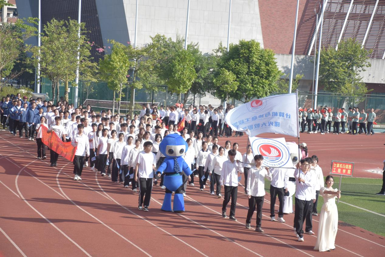 开幕式上,学院师生挥动着手中的院旗,迈着整齐、有力的步伐,喊着激扬的口号走过主席台,展现出计信学子热情饱满的精神风貌。