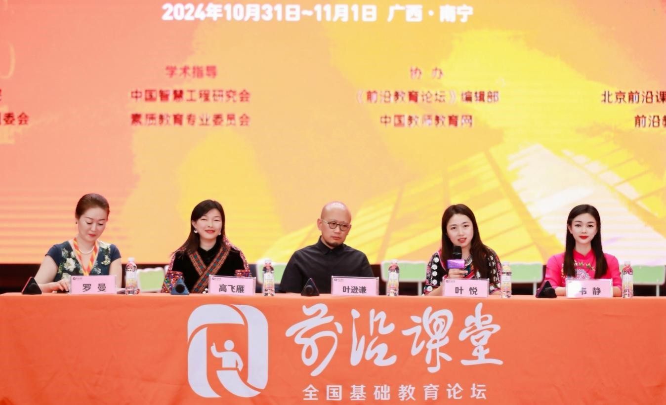 课后,南宁师范大学外国语学院教育戏剧团队高飞雁、叶悦、基地学校南宁市华衡小学科研主任韦静老师以及喜马拉雅教育戏剧研究院院长、中国戏剧文学学会戏剧教育专业委员会主任委员、导演、戏剧教育专家叶逊谦老师共同参与了“前沿课堂”基础教育论坛主席、前沿教育科学研究院院长罗曼主持问课评课、专题指导活动,解答现场观众提出的问题。