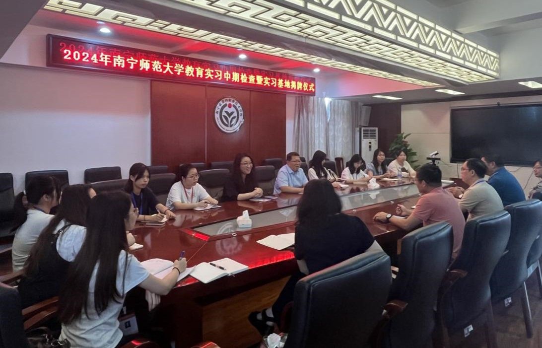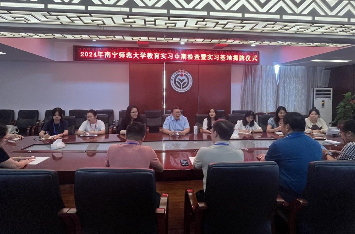 为加强实习过程管理,了解南宁师范大学实习老师在南宁市第四职业技术学校2024年春季学期的实习状态和实习效果,11月14日下午,南宁师范大学外国语学院副院长张晓鹏及带队老师李源来到南宁市第四职业技术学校,对南宁师范大学实习老师在四职校的实习活动开展中期检查工作。两校领导及老师齐聚一堂,共话实习老师阶段性成果与两校合作前景。