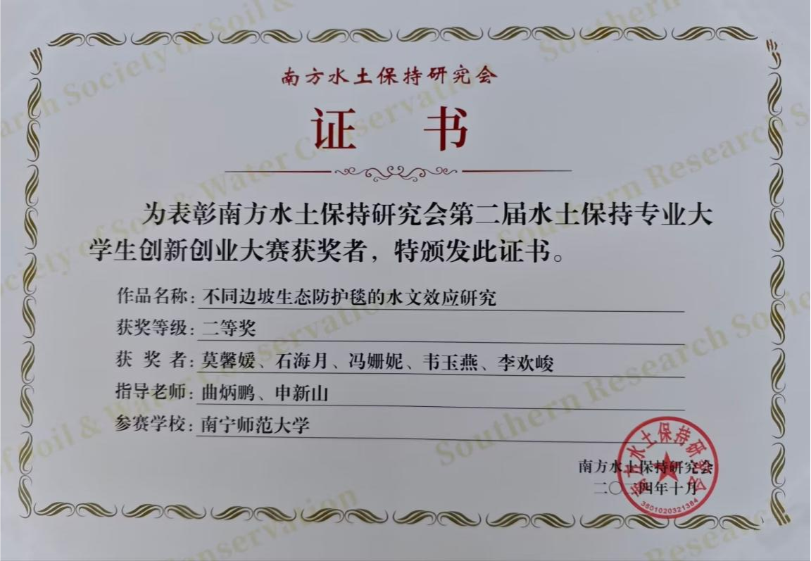 10月27日,南方水土保持研究会第二届水土保持专业大学生创新创业大赛颁奖仪式在重庆西南大学举行。由我校环境与生命科学学院曲炳鹏教师团队指导,莫馨媛、石海月、冯姗妮、韦玉燕、李欢峻同学共同完成的参赛作品《不同边坡生态防护毯的水文效应研究》荣获研究生组二等奖。