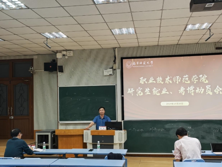 10月30日晚,职业技术师范学院研究生就业暨考博动员会在文星楼110教室举行,学院院长陈良、副院长唐锡海及2025届、2026届全体研究生到场参与。