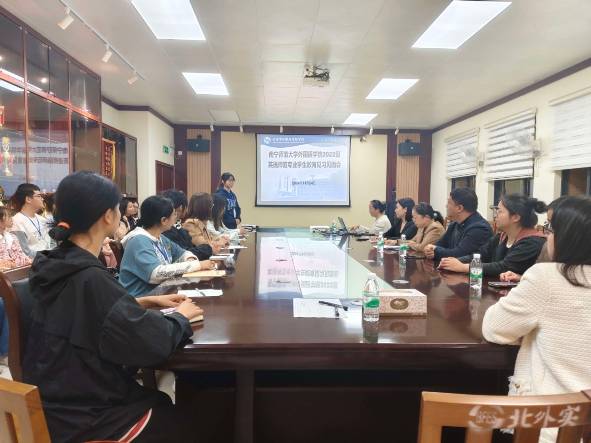 2024年11月24日,为表达欢迎并帮助见习生尽快熟悉和适应学校情况,北海外国语实验学校的领导和指导老师们与我院见习生一起召开了见面会。北海外国语实验学校李艳玲副校长、周光辉副校长,见习年级的年级长和全体见习指导老师及南宁师范大学外国语学院的带队老师邓芳娇携2022级英语师范专业行知班的20名见习生一起出席了会议。