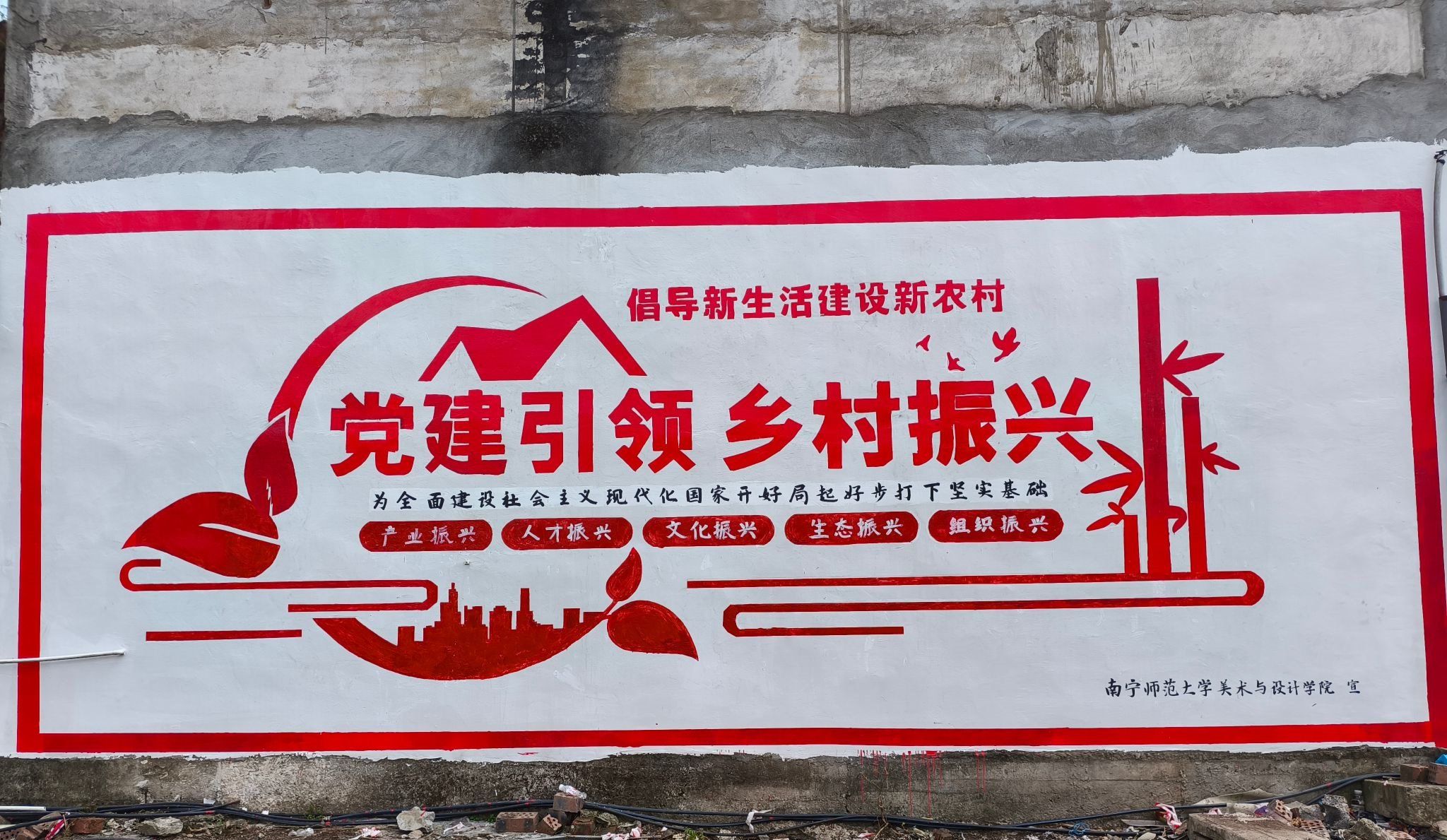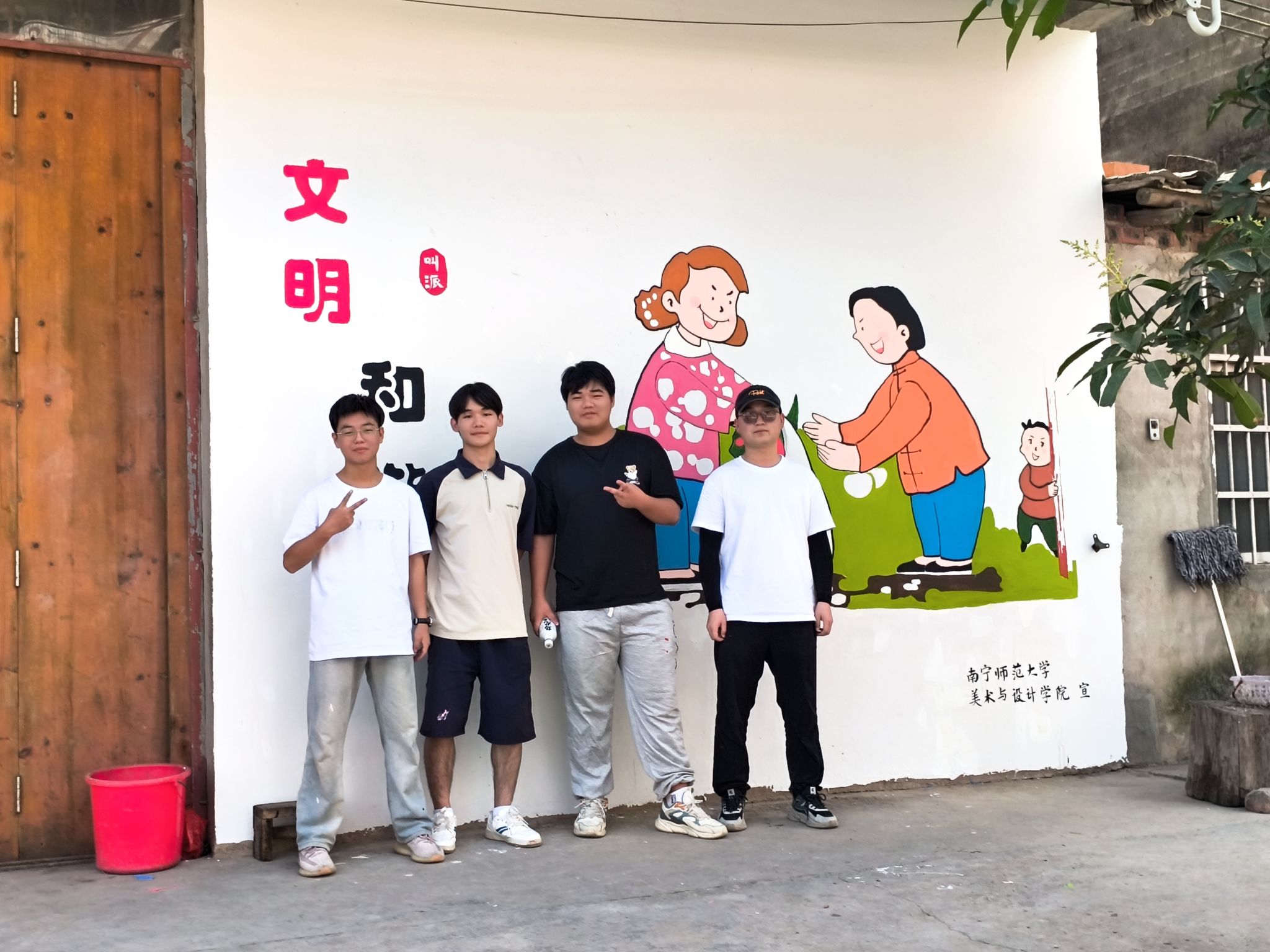 为学习贯彻党的二十届三中全会精神,发挥高校服务乡村文化振兴的专业优势,11月15日至17日,我校应邀派出美术与设计学院师生墙绘工作队一行26人赴学校定点帮扶村宁明县那陶村,开展了“三下乡”乡村振兴墙绘活动。