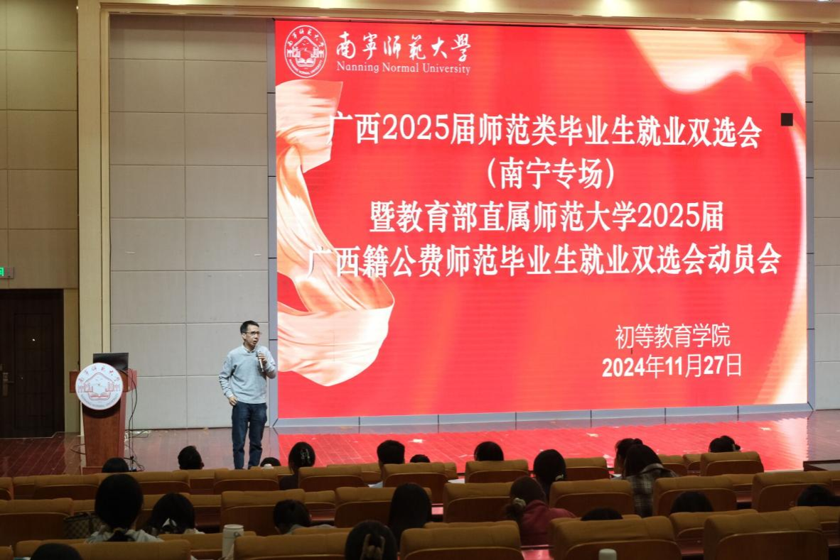 11月27日下午,初等教育学院在五合校区文理综合楼114报告厅召开广西2025届师范类毕业生就业双选会(南宁专场)暨教育部直属师范大学广西籍2025届公费师范毕业生就业双选会动员会,初等教育学院党委书记陆以宏、全体辅导员及2025届毕业生参加会议。