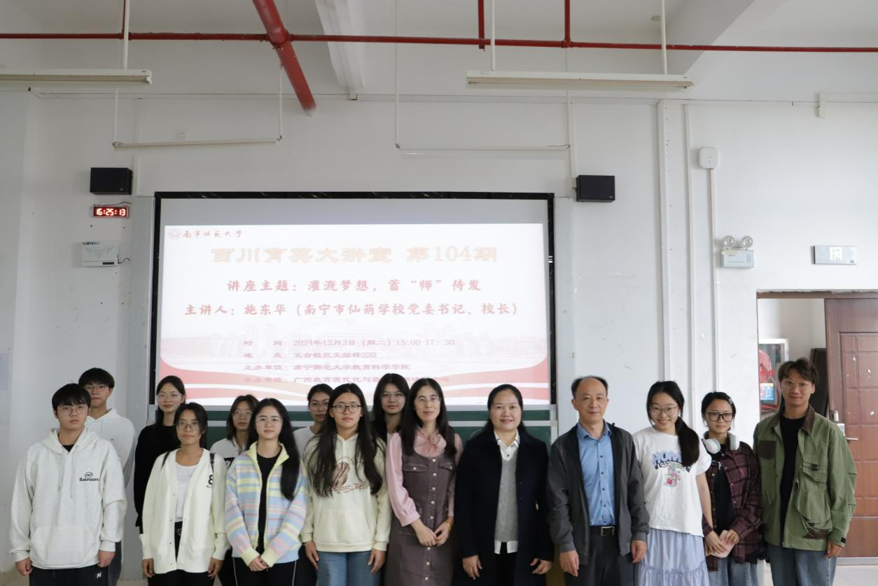 教育科学学院于12月3日下午在五合校区举行主题为“灌溉梦想,蓄‘师’待发”的104期《百川育英大讲堂》讲座。本次讲堂有幸邀请到南宁市仙葫学校党委书记兼校长施东华担任主讲嘉宾,吸引了学院众多教育学、应用心理学、特殊教育学及学前教育专业的学生前来聆听。讲座由学院副院长徐延宇研究员主持。