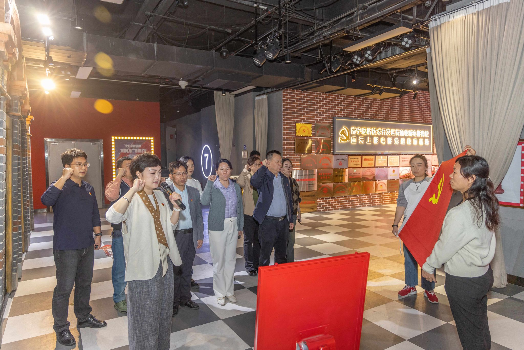 在“看电影 学党史”主题参观中,党员们在讲解老师的带领下,参观了“爱我中华”“我爱你中国”“红船启航”“龙标民族团结柱”“爱南宁爱电影”等红色电影教育场景。这些场景不仅重现了中国共产党的重要历史时刻,也展现了中国电影工业的发展进程。党员们在穿越电影时光隧道的过程中,深度学习了中国共产党党史,对中国电影的“前世今生”有了更深入的了解。