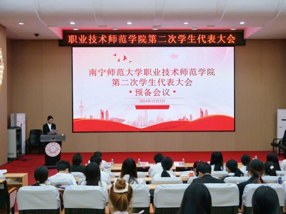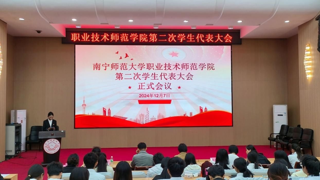 为进一步探索新形势下我院学生工作发展的新思路、新方法,提升学生的自主参与度,同时广泛听取学生的建议,为学校的发展注入新的活力,职业技术师范学院于12月7号上午在文星楼301报告厅召开第二次学生代表大会。学院党委书记李穗,党委副书记、纪委书记刘卫华,团委书记黄洪辉,政治辅导员韦链及61名正式学生代表参会。此外,大会特别邀请了国际教育学院学生代表,共同见证我院学生代表大会的召开。