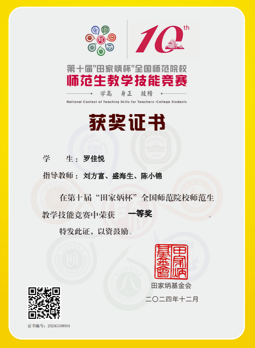 近日,“田家炳杯”第十届全国师范院校师范生教学技能竞赛决赛结果正式公布,法学与社会学院2021级历史学本科专业罗佳悦同学荣获全国师范院校师范生教学技能大赛决赛一等奖。