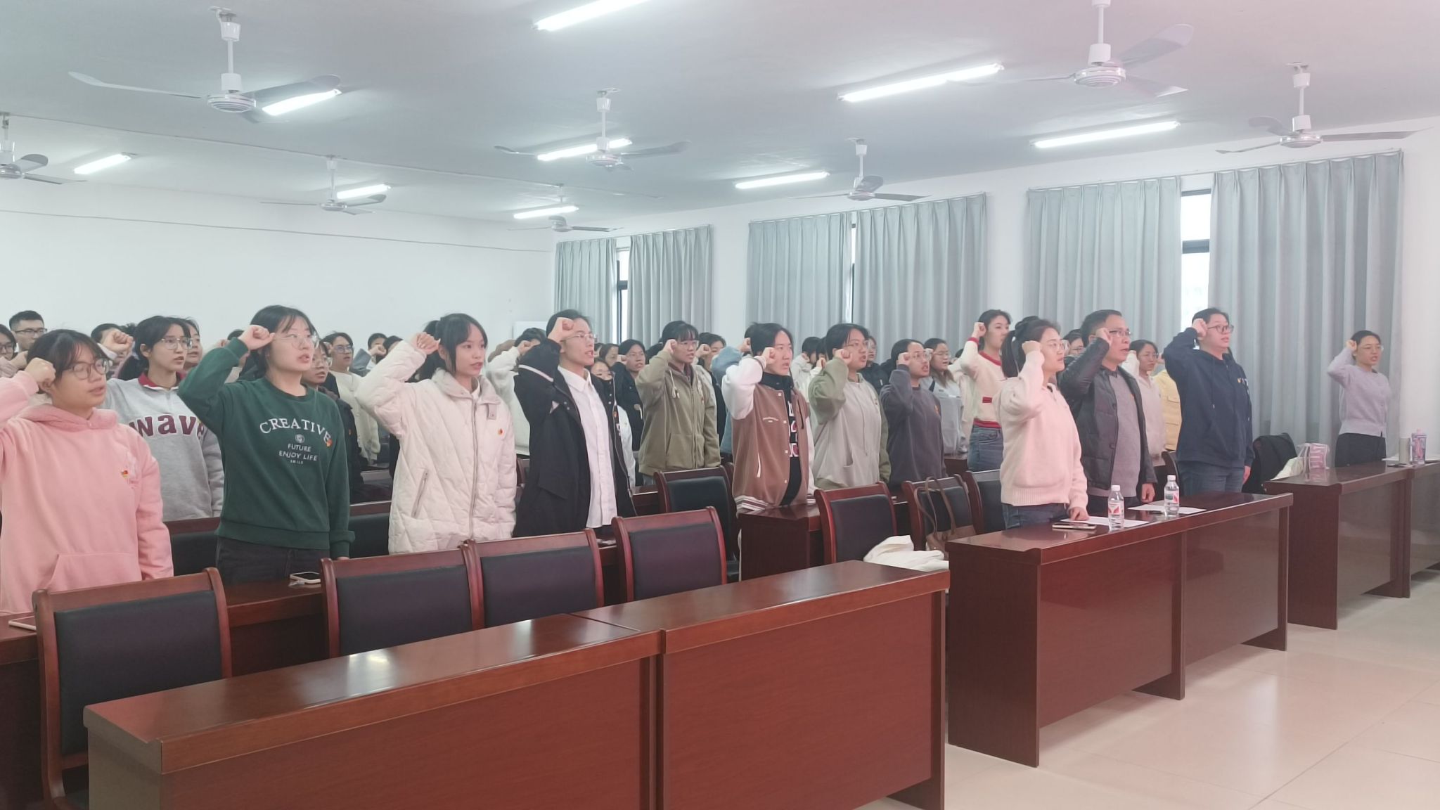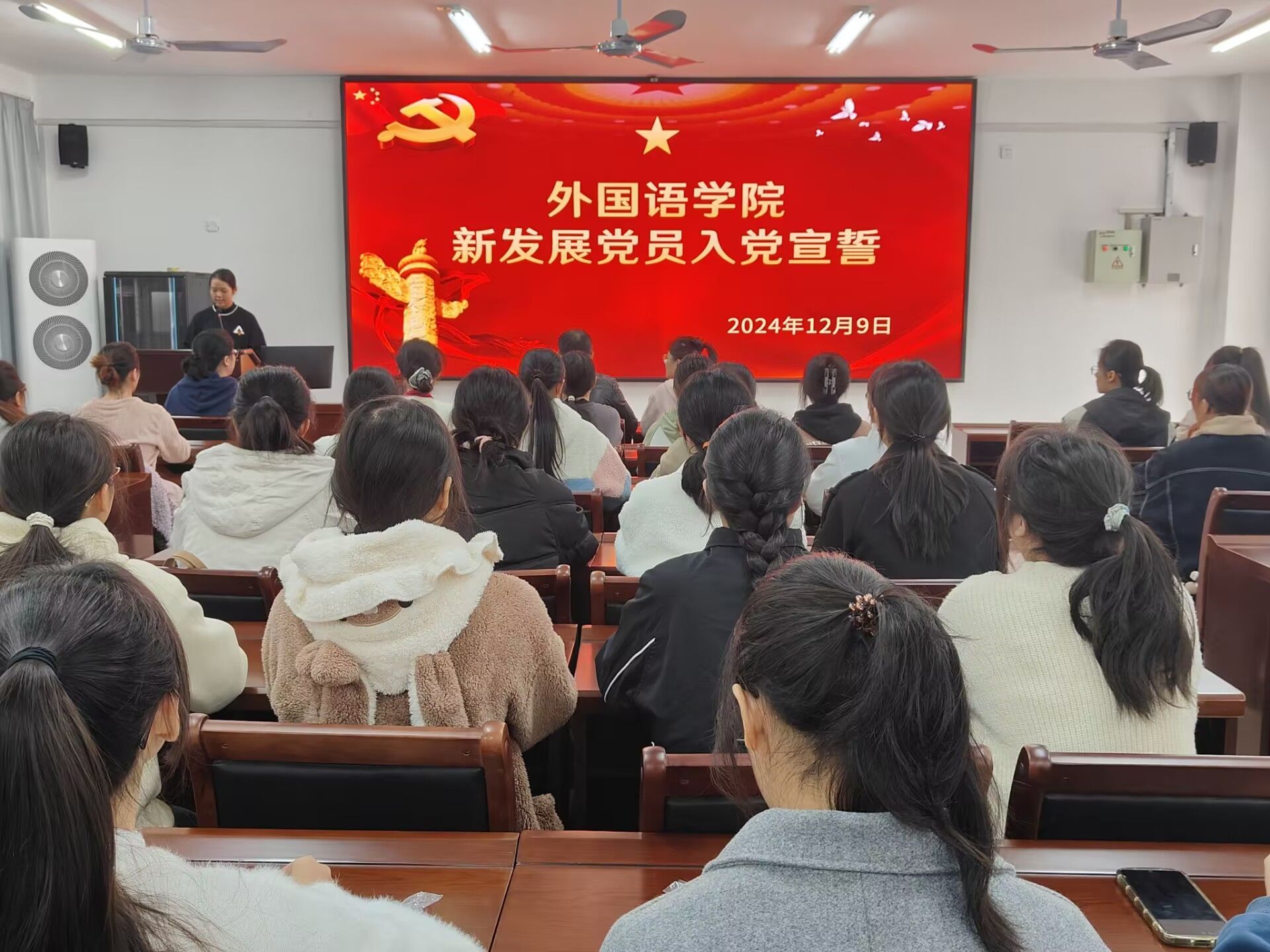 2024年12月9日中午,外国语学院于实验楼1B-515教室组织召开2024年下半年新发展党员入党宣誓仪式。外国语学院党委苏华书记、部分正式党员以及2024年下半年新发展的72名党员参加了本次入党宣誓仪式,会议由党务助理莫晓滢主持。