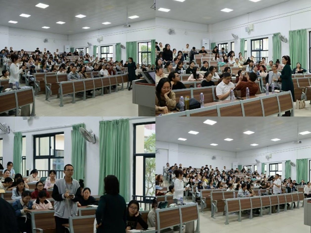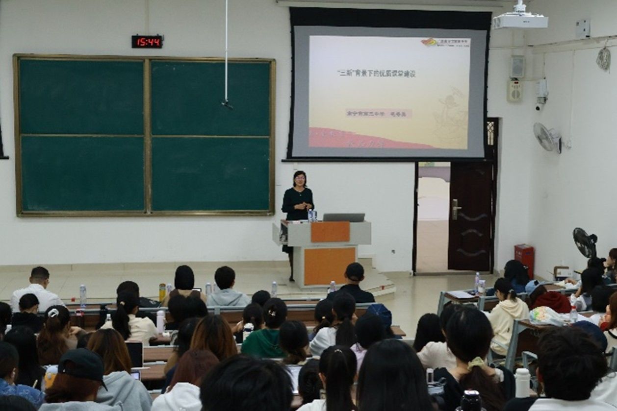 毛秀英老师分享的主题为《“三新”背景下的优质课堂建设》,她先对“三新”背景做了深刻的剖析,又从“精心策划课前设计、用心演绎课堂过程、细心开展全面评价”三个部分为同学解答了如何建设优质课堂,同时旁征博引,分享了许多课堂教学案例,展现了名师风采。
