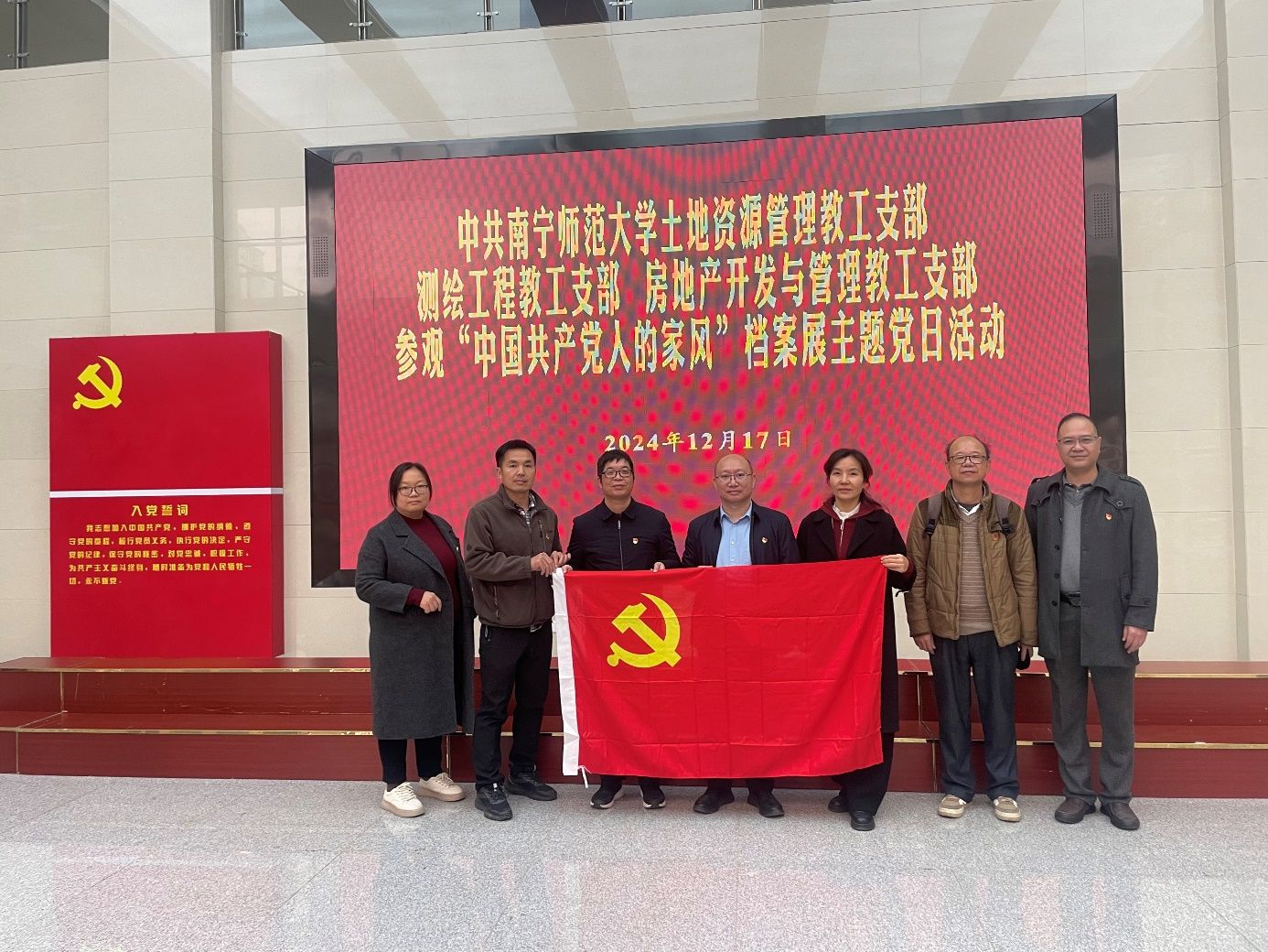 为深入开展党纪学习教育,进一步加强党员教师的党性修养、家风家风教育,12月17日,自然资源与测绘学院土地资源管理系教工党支部联合测绘工程、房地产开发与管理等两个支部赴广西壮族自治区档案馆,开展以“传承红色家风,赓续奋斗精神”为主题的党日活动。
