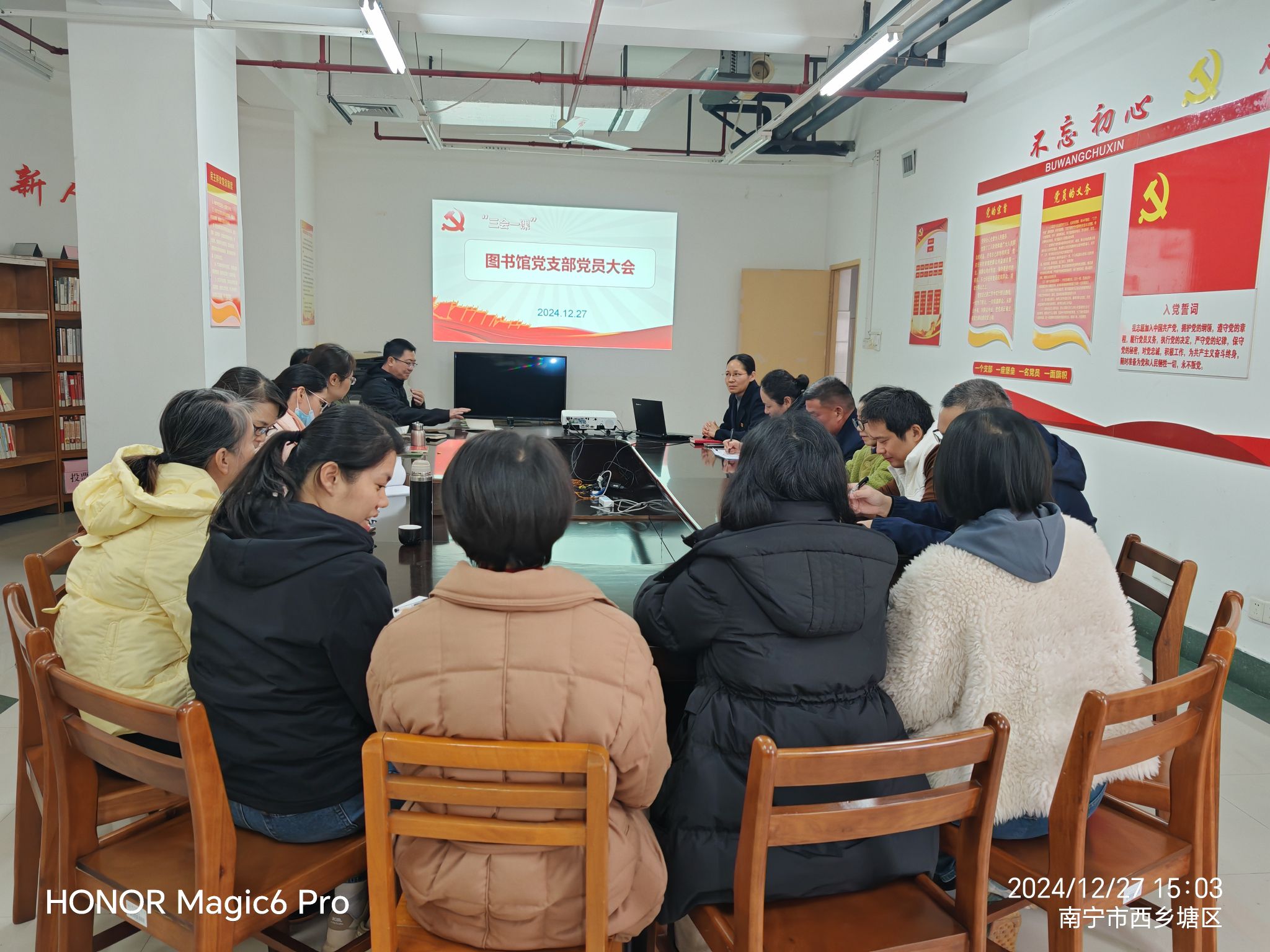 12月27日下午,图书馆党支部在明秀馆11楼党员活动室召开第四季度党员大会,会议学习了习近平总书记近期重要讲话、指示精神,传达、学习了学校党委下发的有关文件通知精神,讨论、部署如何进一步做好党支部工作。全体党员参加了会议,会议由党支部书记叶佩珍同志主持。