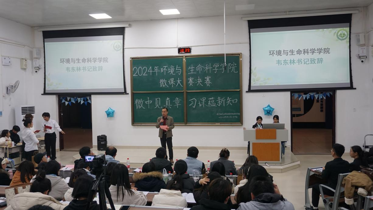 为激发学生们的创新活力,提升教学技能与信息技术应用能力,促进优质教育资源的共享与传播,环境与生命科学学院于12月24日晚在武鸣校区地海楼B109教室举办了“微中见真章,习课蕴新知”微课大赛决赛。本次大赛邀请到学院党委副书记(主持党委工作)韦东林,专任教师王鑫宇、黄富、张拓、李鹏、郄亚栋,团委书记刘雅楠、辅导员龚炜婷,兼职辅导员莫馨媛、聂燕担任评委,此外,各二级学院代表以及学院主席团成员也出席了本次大赛。