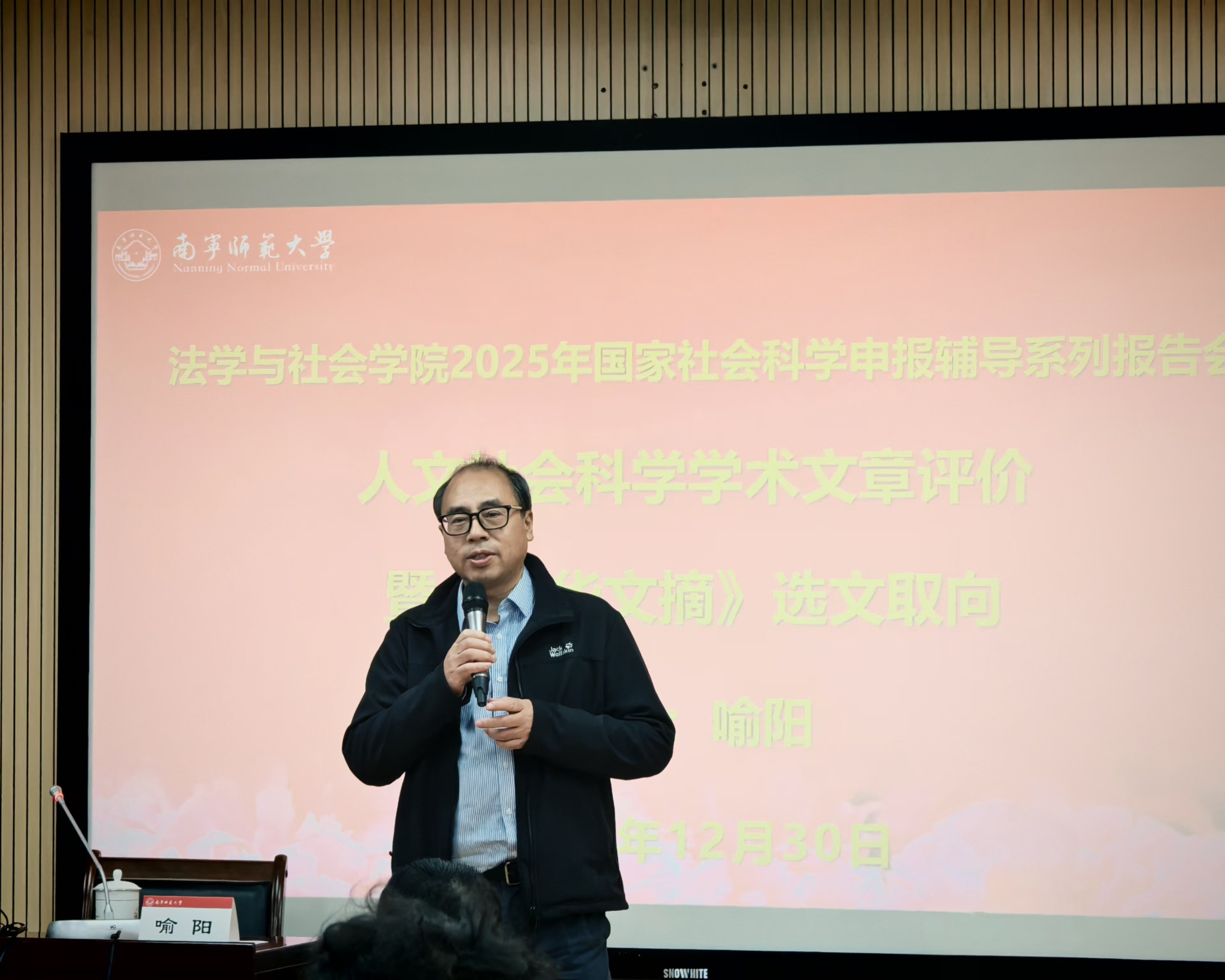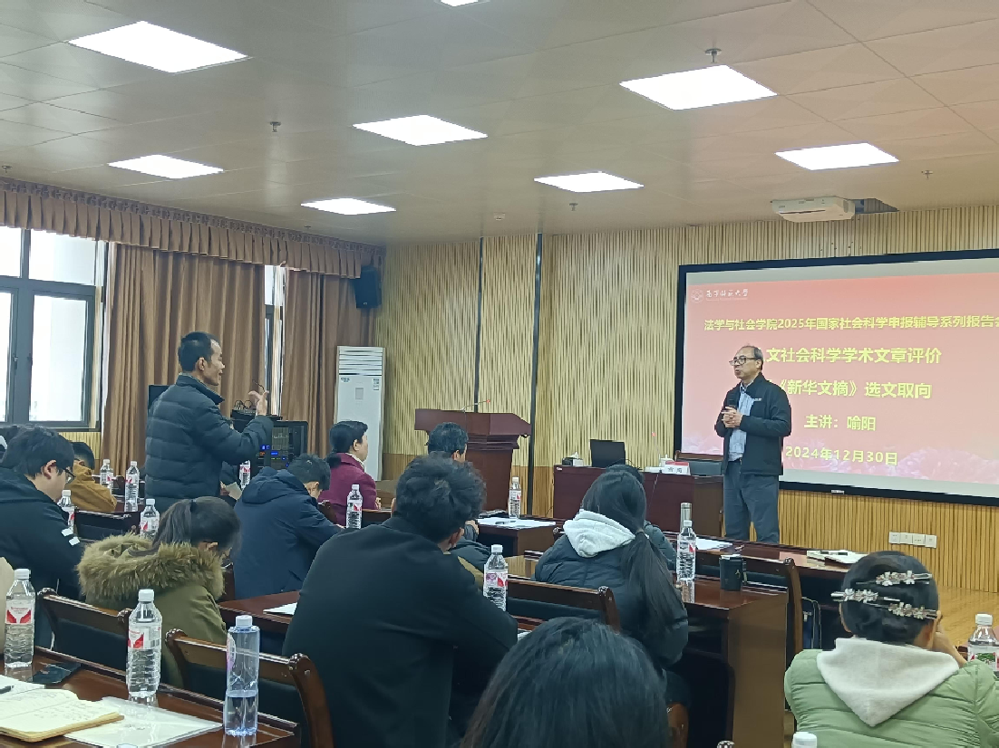 为有效提升师生的科研能力和学术水平,法学与社会学院于2024年12月30日邀请《新华文摘》原总编辑喻阳编审作为主讲嘉宾,作了题为“人文社会科学学术文章评价暨《新华文摘》选文取向”的讲座。