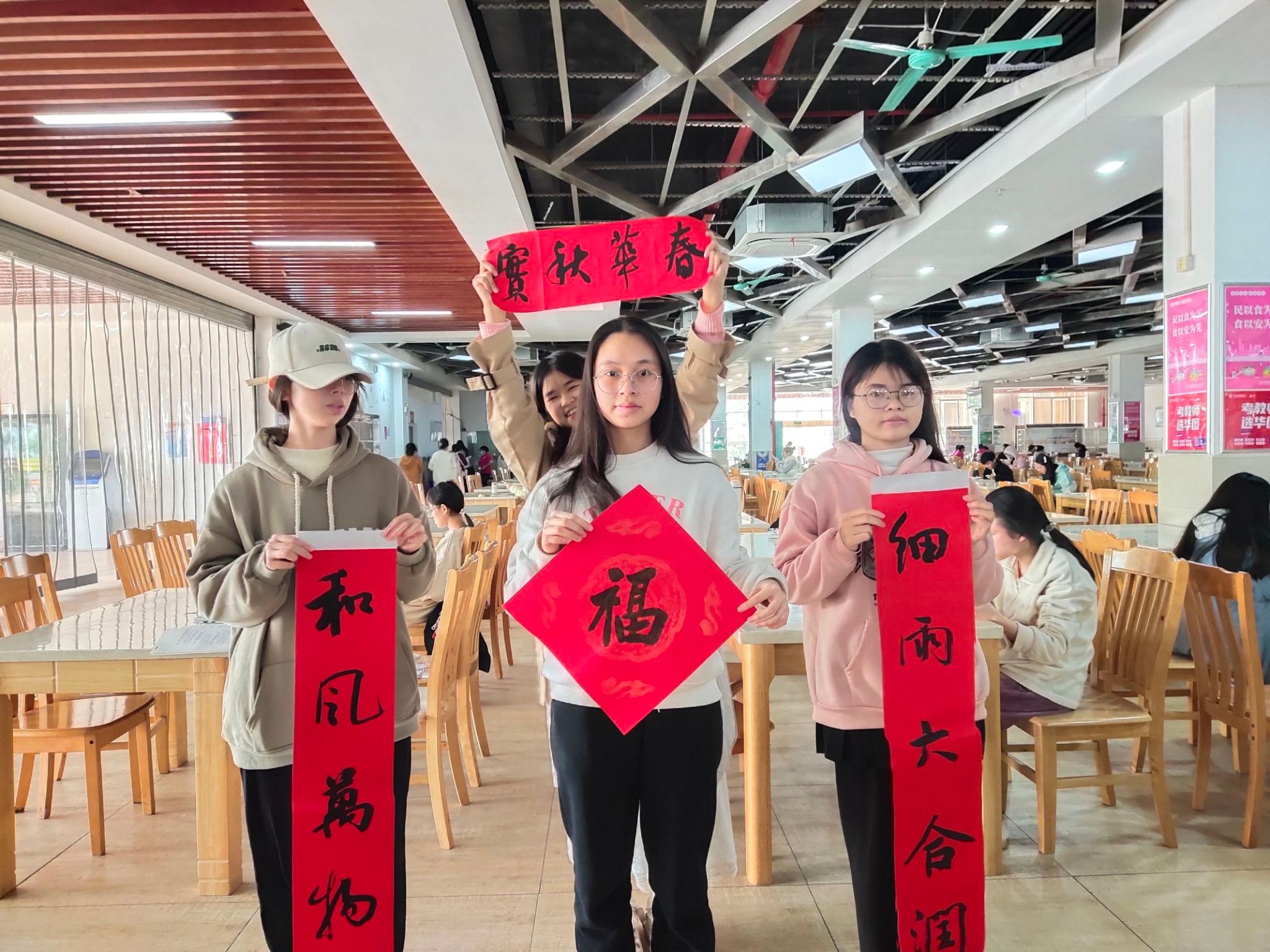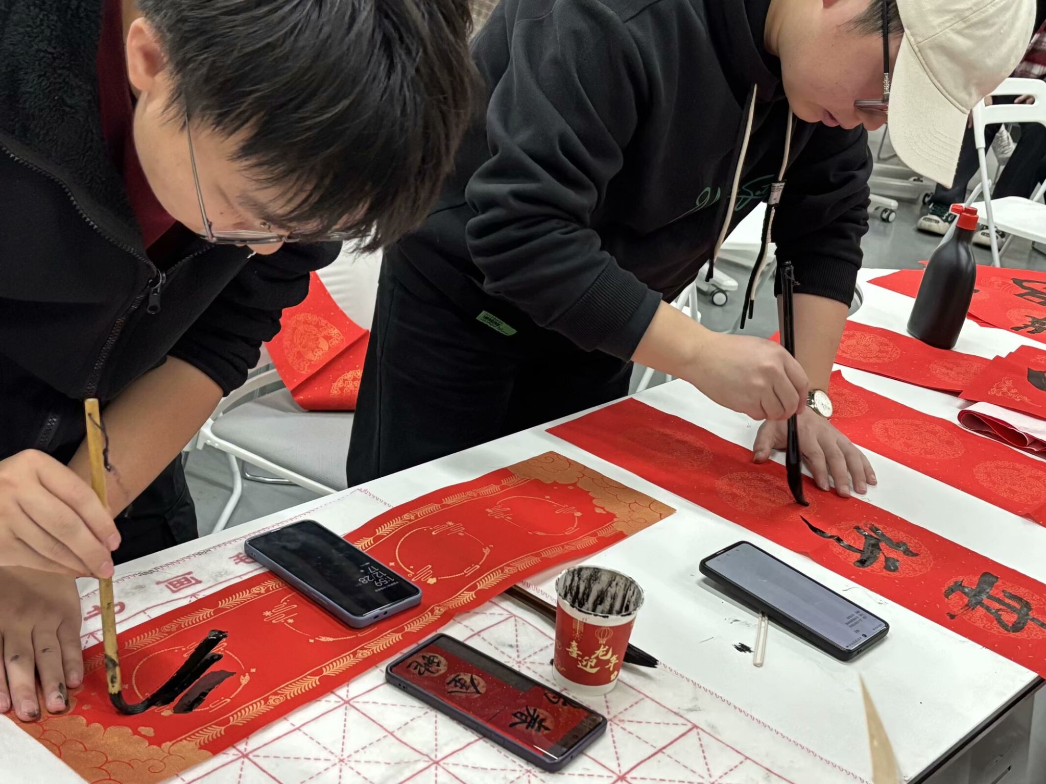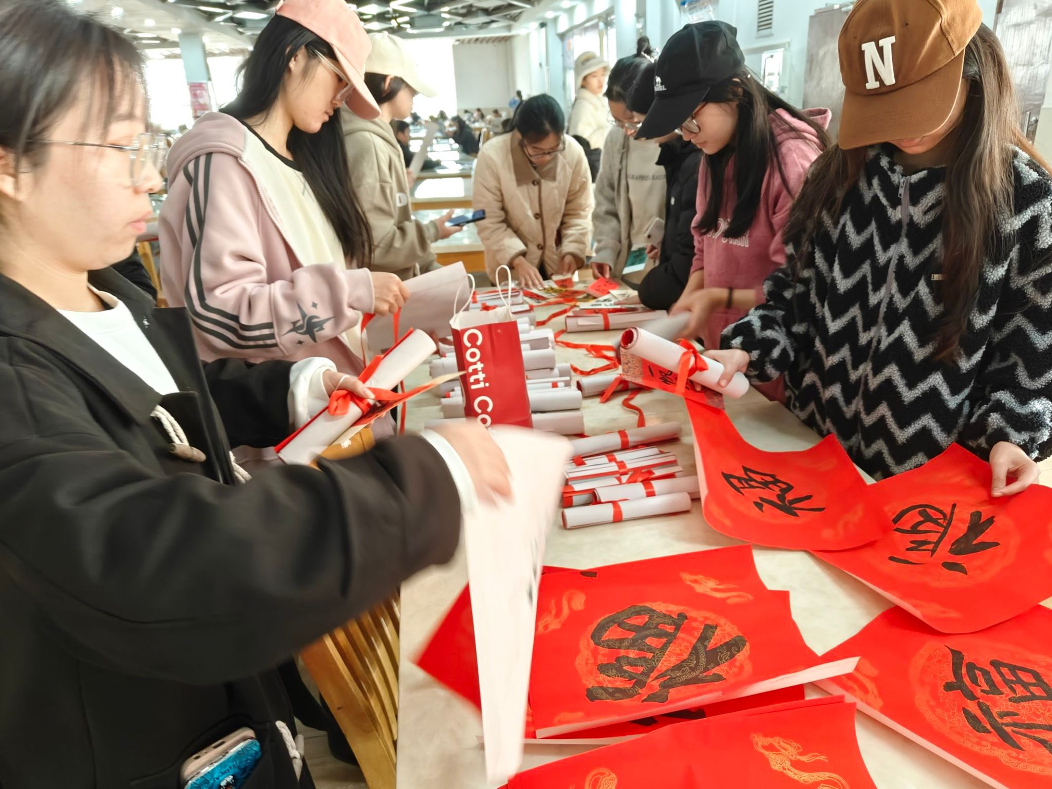 活动现场热闹无比,书香与墨香交织,营造出浓厚的节日氛围。书画协会的同学们早早地来到现场,书写一幅幅寓意吉祥、翰墨飘香的春联。这些春联内容广泛,既有传统的祝福词句,如“岁岁平安福寿多,年年顺景财源广”,也有富有创意的现代词句,如“智慧如星照学海,才华似月映文林”。每一副春联都承载着书画协会成员对老师同学们的美好祝愿和深情厚意。