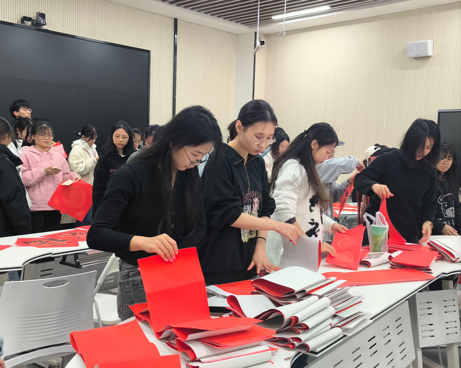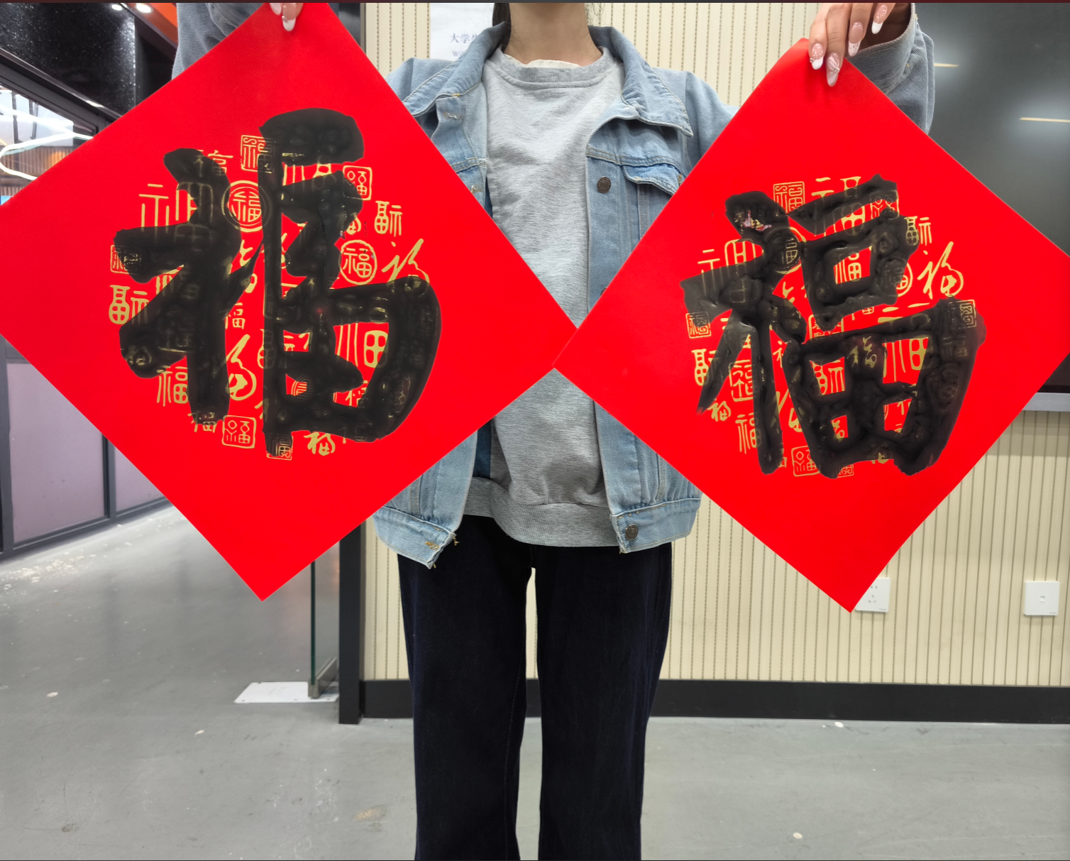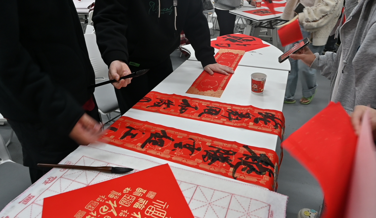 活动现场热闹无比,书香与墨香交织,营造出浓厚的节日氛围。书画协会的同学们早早地来到现场,书写一幅幅寓意吉祥、翰墨飘香的春联。这些春联内容广泛,既有传统的祝福词句,如“岁岁平安福寿多,年年顺景财源广”,也有富有创意的现代词句,如“智慧如星照学海,才华似月映文林”。每一副春联都承载着书画协会成员对老师同学们的美好祝愿和深情厚意。
